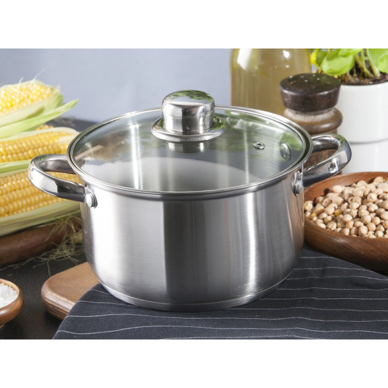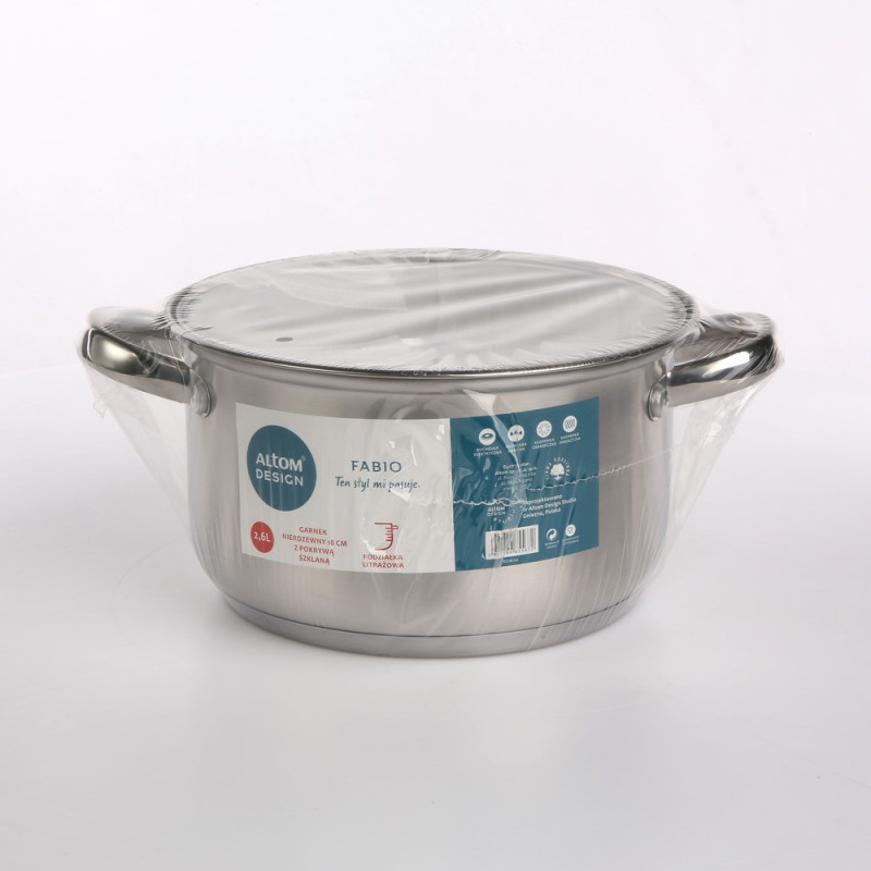 FABIO LONAC OD NEHRĐAJUĆEG ČELIKA 2,6L. 18CM SA STAKLENIM POKLOPCEM Lonac je izrađen od izdržljivog i sigurnog nehrđajućeg čelika Lonac od nehrđajućeg čelika lako se čisti. Sigurno za perilicu posuđa Lonac od nehrđajućeg čelika može se koristiti na svim vrstama štednjaka, uključujući indukcijske štednjake Unutar lonca nalazi se mjerna traka koja će olakšati mjerenje Stakleni poklopac savršeno se uklapa u lonac. Ima rupu za izlaz pare
