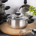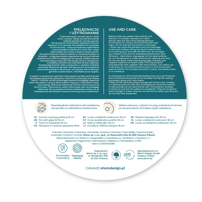 Emilio lonci od nehrđajućeg čelika – elegancija i trajnost na vašem kuhinjskom putu. Emilio lonci od nehrđajućeg čelika kombinacija su trajnosti, funkcionalnosti i elegancije u jednom. Izrađene od visokokvalitetnog nehrđajućeg čelika, izrađene su kako bi se suočile i s najzahtjevnijim kulinarskim izazovima. Bez obzira jeste li iskusni kuhar ili tek započinjete svoju avanturu kuhanjem – naši lonci bit će vaš nezamjenjiv partner u kuhinji i pomoći će vam da postignete izvrsne rezultate. ·      Napravljene posude izrađena od najkvalitetnijeg nehrđajućeg čelika, koji predviđa Čak i raspodjela topline za savršene kulinarske rezultate. ·      Nehrđajući čelik je Otporan na koroziju, mrlje i mehanička oštećenja, što znači da će lonci zadržati svoj izgled i funkcionalnost dugi niz godina. ·      Debljina stijenke lonca je 0,4 mm, tako da Posuđe duže čuva toplinu. ·      Hvala prozirni stakleni poklopci, možete slijediti svaki korak kuhanja bez potrebe za skidanjem, štedeći vam vrijeme i energiju. ·      Odušak za paru U poklopcu vam omogućuje kontrolu količine pare koja se oslobađa tijekom kuhanja. ·      Nehrđajući čelik je prehrambeno neutralan materijal, što znači da ne ispušta tvari u posuđe i ne mijenja njihov okus. ·      Minimalistički i moderan dizajn lonaca iz kolekcije Emilio čini uklopiti se u svaki interijer. ·      Bakelitne ručke otporni su na temperature do 180 °C. ·      Nehrđajući čelik lako se održava čistim. Emilio Lonci mMožete ga oprati u perilici posuđa. ·      Lonac od nehrđajućeg čelika možete koristiti na svim vrstama štednjaka, uključujući indukciju.   Kapacitet proizvoda : 1,9 l Promjer: 18 cm Visina: 8,5 cm