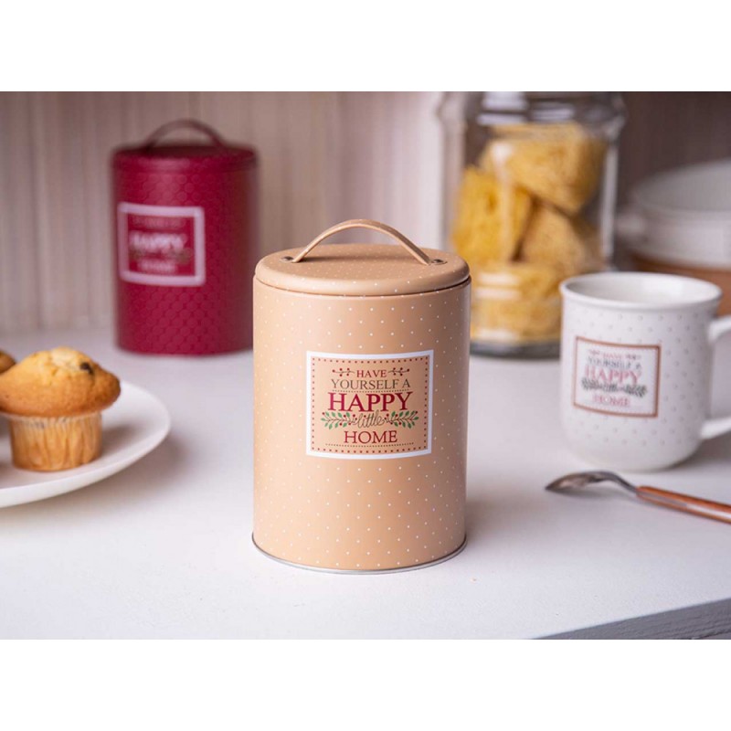 Okrugla limenka / spremnik za rasute proizvode Altom Design Happy Home s ručkom Kolekcija Happy Home – dom u skladu s prirodom. Dimenzije limenke: promjer – 10,5 cm,visina – 16 cm