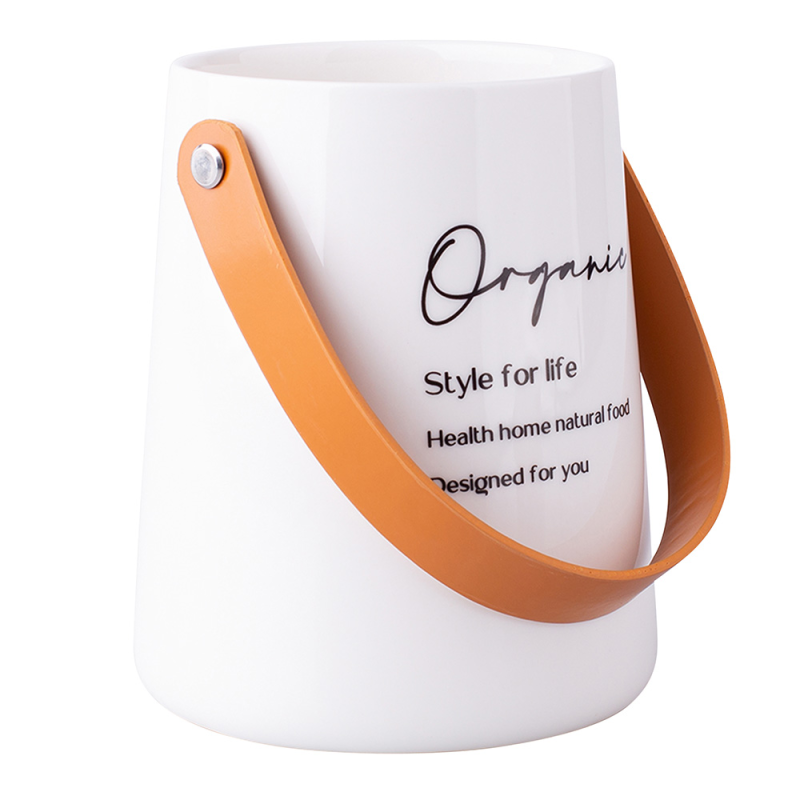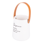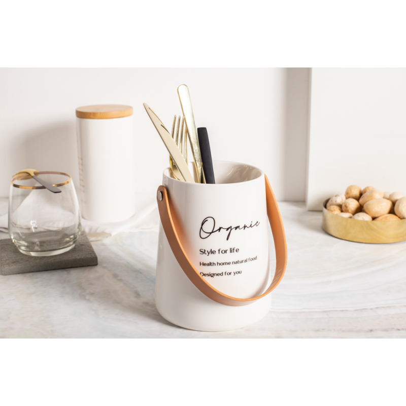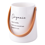 Širina – 12 cm Visina – 14 cm Porculansko posuđe s ručkom, izrađeno od eko kože, lijep i praktičan ukras stola. To će biti idealno za spremanje pribora za jelo ili izlaganje buketa cvijeća na neobičan način. Porculansko posuđe savršeno se slaže s drugim posuđem i kuhinjskim priborom iz linije Organic. Izvorna kombinacija porculana s ručkom od eko kože čini je dizajnerskim ukrasom kuhinje ili blagovaonice Kolekcija inspirirana prirodom i ekologijom Izrađena je od porculana New Bone s blago kremastom bojom To će biti izvrstan dodatak dekoru svake kuhinje ili blagovaonice. Materijal: NBC porculan, eko koža Perilica: NE