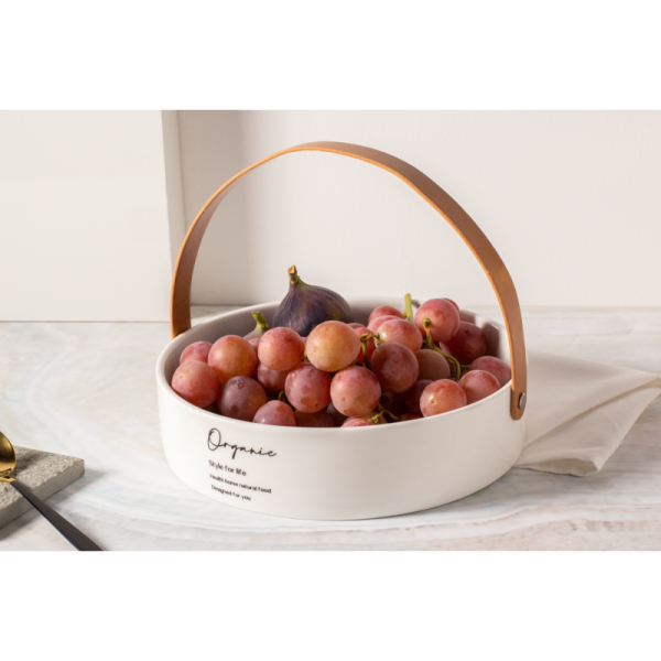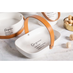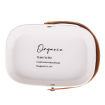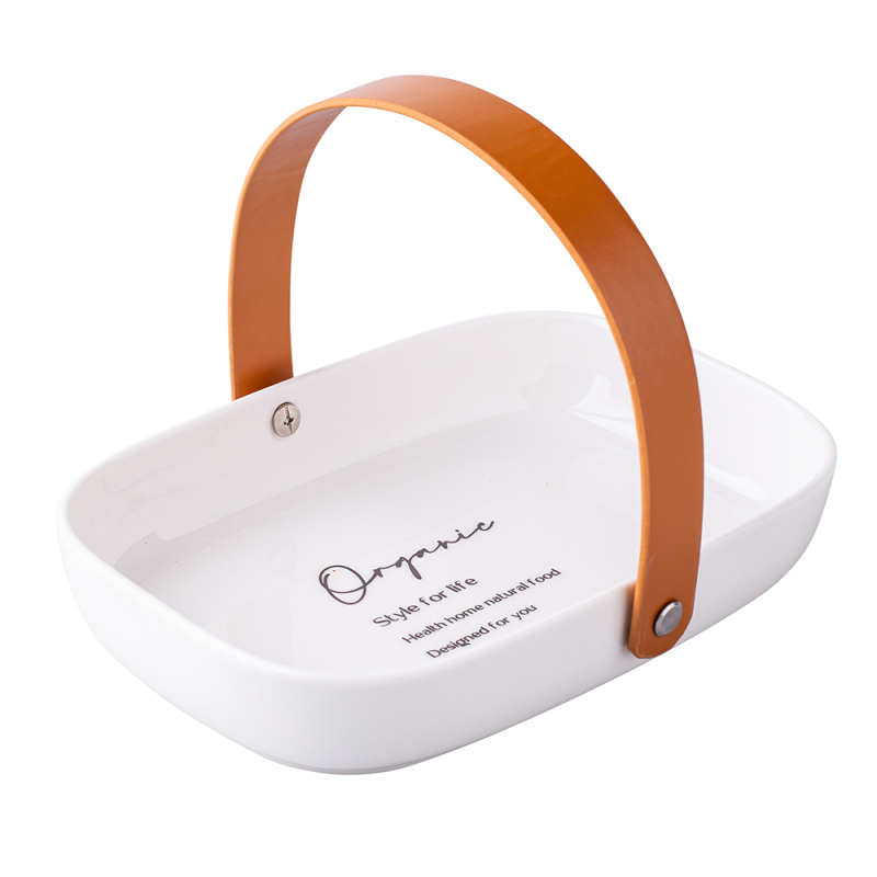 duljina – 20 cm širina – 14 cm visina – 4 cm Porculansko posuđe s ručkom, izrađeno od eko kože, lijep i praktičan ukras stola. To će biti idealno za spremanje pribora za jelo Porculansko posuđe savršeno se slaže s drugim posuđem i kuhinjskim priborom iz linije Organic. Izvorna kombinacija porculana s ručkom od eko kože čini je dizajnerskim ukrasom kuhinje ili blagovaonice Kolekcija inspirirana prirodom i ekologijom Izrađena je od porculana New Bone s blago kremastom bojom To će biti izvrstan dodatak dekoru svake kuhinje ili blagovaonice. Materijal: NBC porculan, eko koža Perilica: NE