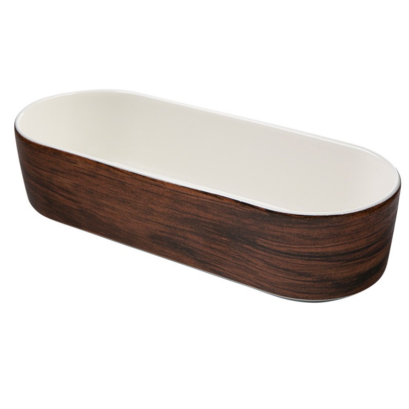 Happy Home Collection – dom u skladu s prirodom. Dimenzije posude za pečenje:duljina – 26 cmširina – 11 cmvisina – 6,5 cm Inspiracija s prirodom stvara ukrase koji podsjećaju na drvo, kamen, glinu i druge prirodne materijale. Porculanska jela odjevena u prirodni ogrtač ugodna su oku, odgovaraju modernim kuhinjama, savršena su i za drvene kuće, vrtne stolove i rustikalne interijere. Stilizirane posude za pečenje istodobno su estetski element posuđa, pa se jelo nakon vađenja iz pećnice može staviti na posteljicu ili dasku na stol, bez potrebe za prebacivanjem u tanjure ili zdjele. U istoj posudi pripremamo i poslužujemo delicije. Kolekcija Happy Home sastoji se od elemenata porculanskog pribora za jelo od kojih možete stvoriti skladan set za doručak i deserte. Kolekcija je ukrašena ukrasima koji podsjećaju na drvo ili glinu. Ovalna posuda za pečenje izrađena je od visokokvalitetnog ojačanog porculana s blago kremastom nijansom. Posuda ne reagira s hranom pa je potpuno sigurno za zdravlje. Zahvaljujući glatkoj površini lako se održavaju. Također je odličan način posluživanja jela. Ukrašen drvenim motivom ugodan je za oko i podudara se s rasporedima stolova nadahnutih prirodom . Svi elementi od porculana iz kolekcije Happy Home mogu se prati u perilici posuđa .