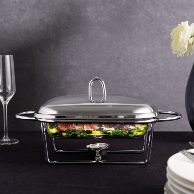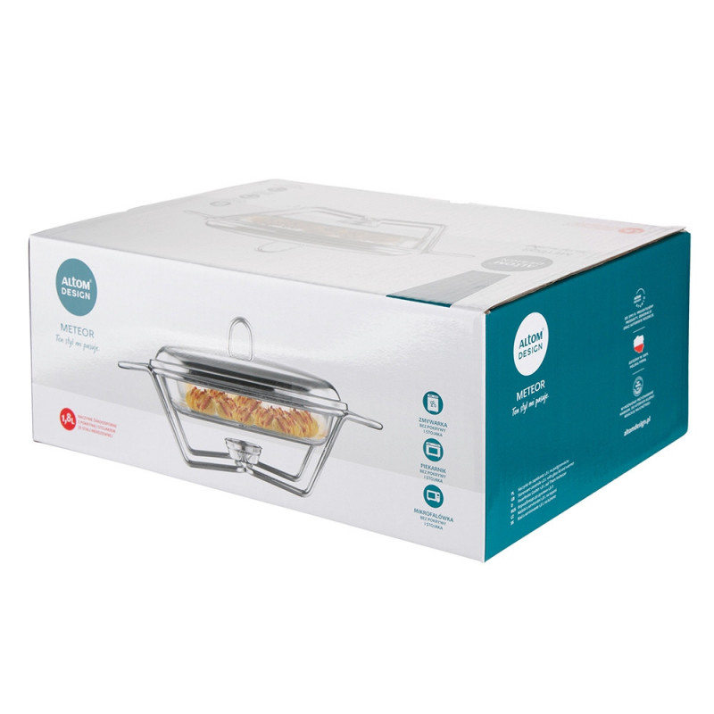 Jela poslužena na stolu koja se ne hlade? Da, sada je to moguće s linijom posuđa otpornih na toplinu na grijaču. Zahvaljujući posudama otpornim na toplinu na grijaču, možemo duže održavati pravu temperaturu, okus i aromu pripremljenih jela, a istovremeno očarati goste učinkovitim posluživanjem.   kapacitet – 1,8 ldužine – 37 cm širine – 25 cm visine – 15 cm Linija posuđa otpornih na toplinu na grijaču kombinacija je elegancije i upotrebljivosti Posuđe na grijaču savršeno je za posluživanje jela tijekom raskošnih zabava Praktična, staklena jela savršeno se stapaju s bilo kojim posuđem Stabilan stalak od kromiranog čelika ima prostora za postavljanje svijeća Zahvaljujući grijačima, poslužena jela dugo će ostati topla Glatka staklena površina može se lako održavati čistom, posuda se može oprati u perilicama posuđa (osim postolja)