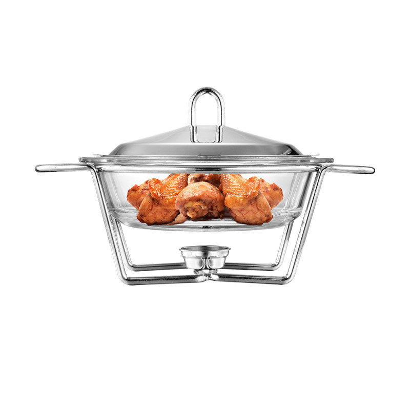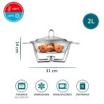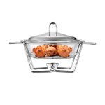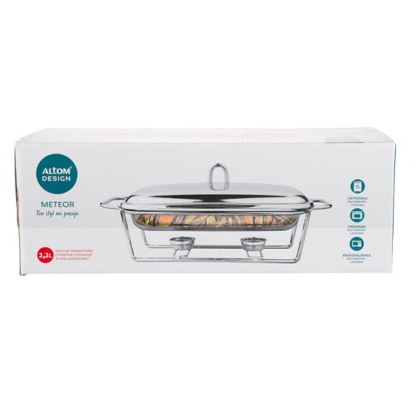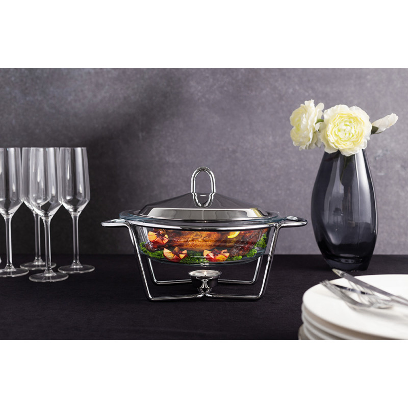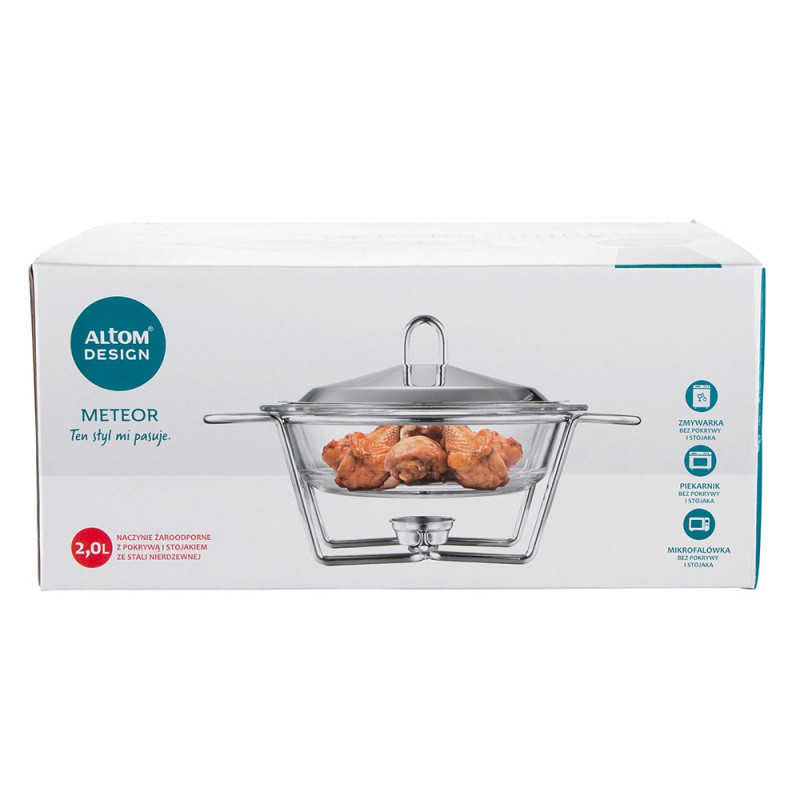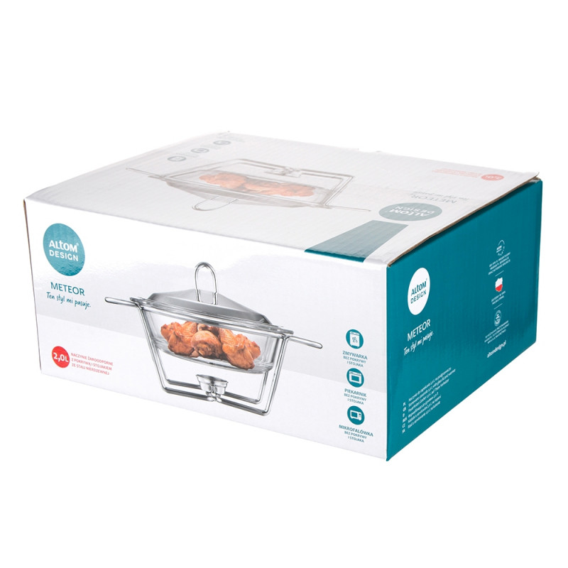 Jela poslužena na stolu koja se ne hlade? Da, sada je to moguće s linijom posuđa otpornih na toplinu na grijaču. Zahvaljujući jelima otpornim na toplinu na grijaču, možemo duže održavati pravu temperaturu, okus i aromu pripremljenih jela, a istovremeno očarati goste učinkovitim posluživanjem. kapacitet – 2,0 ldužine – 31 cm širine – 25 cm visine – 14 cm Linija posuđa otpornih na toplinu na grijaču kombinacija je elegancije i upotrebljivosti Posuđe na grijaču savršeno je za posluživanje jela tijekom raskošnih zabava Praktična, staklena jela savršeno se stapaju s bilo kojim posuđem Stabilan stalak od kromiranog čelika ima prostora za postavljanje svijeća Zahvaljujući grijačima, poslužena jela dugo će ostati topla Glatka staklena površina može se lako održavati čistom, posuda se može oprati u perilicama posuđa (osim postolja)