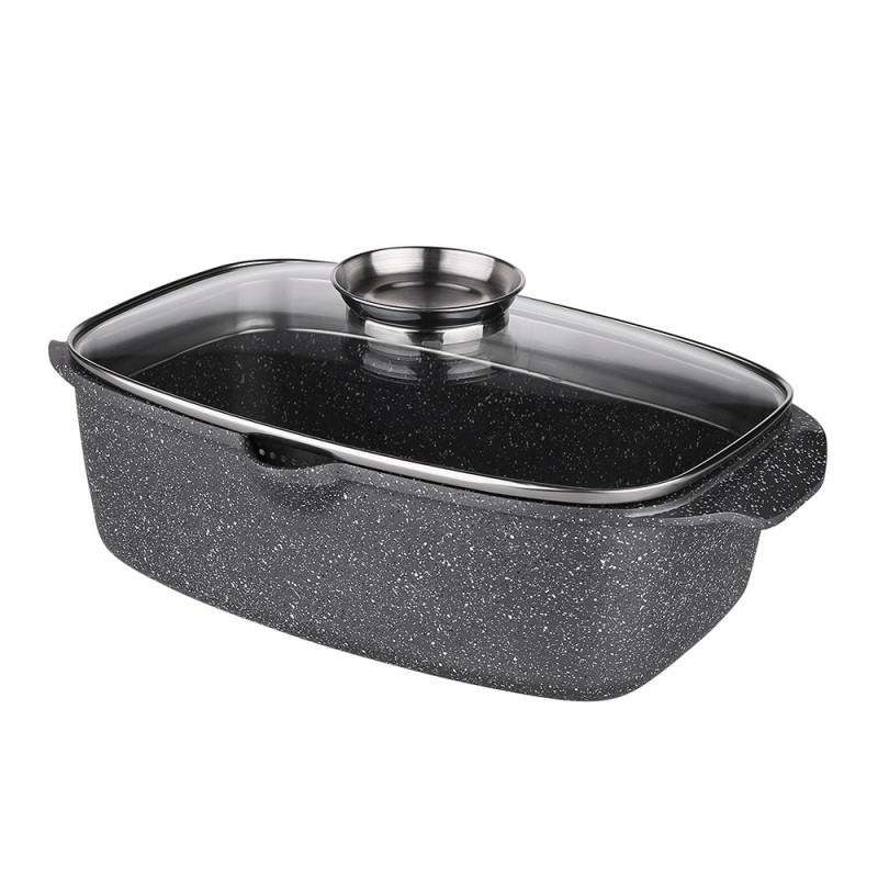 Altom Design posuda za pečenje Valdinox Rock 32cmx21cm Pogodan je za sve vrste štednjaka, uključujući indukcijske štednjake i za pečenje u pećnici (* poklopac do 180 °C, posuda za pečenje do 230 °C) Vanjske dimenzije posude :- duljina – 39,5 cm- širina – 23 cm- visina – 16 cmUnutarnje dimenzije posude:- kapacitet – 5,7 l- duljina – 32 cm- širina – 21 cm