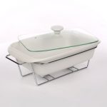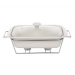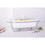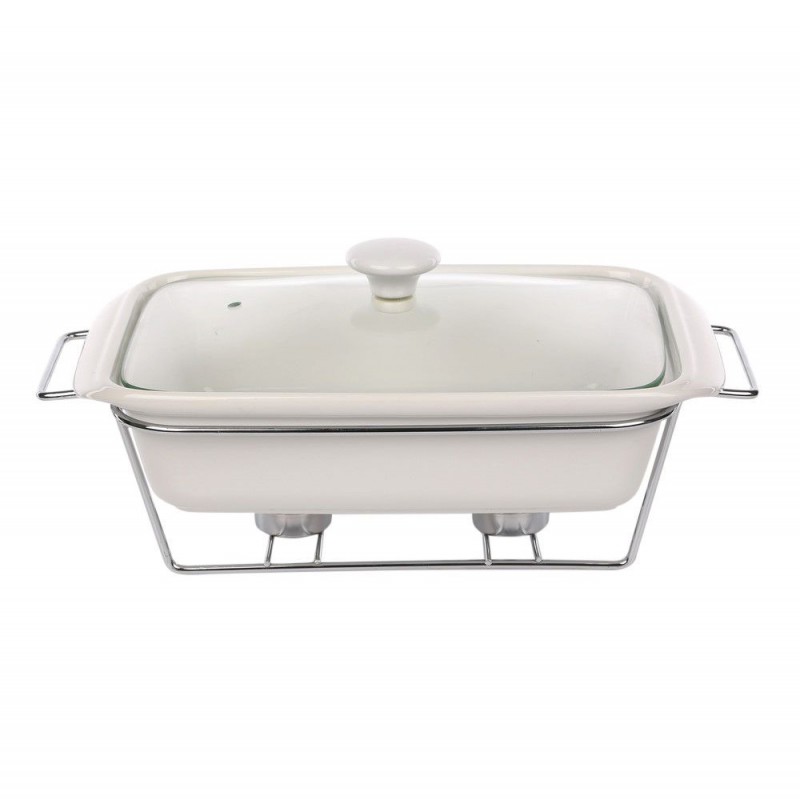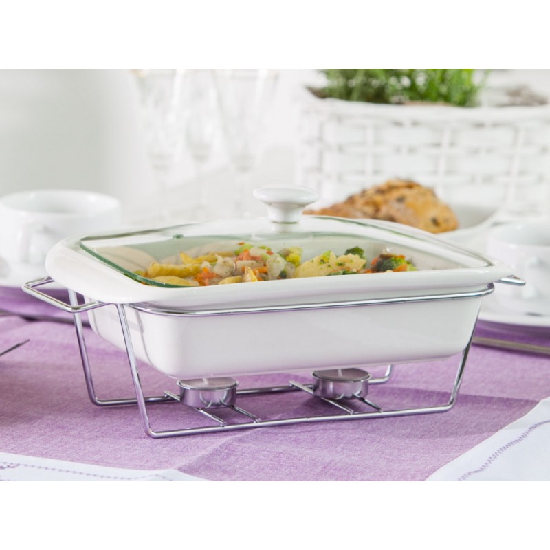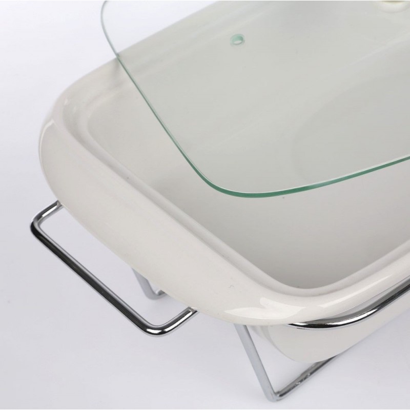 · Linija porculanskog posuđa Mesa na grijaču kombinacija je elegancije i korisnih vrijednosti. · Omogućuje vam pečenje jela na visokoj temperaturi u pećnici i mikrovalnoj pećnici. Univerzalna, bijela boja posuđa čini ih savršenima za svaki stol. Stabilno postolje izrađeno od kromiranog čelika omogućuje vam posluživanje tople hrane izravno od pećnice do stola. Zahvaljujući grijačima, servirana jela dugo će ostati topla. Stakleni poklopac završen keramičkom ručkom omogućuje upotrebu u pećnici bez straha od pucanja. Izlaz pare smanjuje pritisak unutar posude, smanjujući mogućnost prekuhavanja hrane. Glatka keramička površina lako se čisti, posuđe se može prati u perilicama posuđa bez ikakvih prepreka. Dimenzije posude:duljina: 36 cm,širina: 21 cm,visina: 12 cm,kapacitet: 2,1 l ·