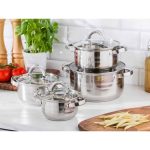 Set lonaca Marco od nehrđajućeg čelika učinit će vas majstorom kuhanja Set uključuje : 1 x lonac s poklopcem 14 cm – 1,3 l, visina – 8,5 cm 1 x lonac s poklopcem 16 cm – 1,9 l, visina – 9,5 cm 1 x lonac s poklopcem 18 cm – 2, 6 l, visina – 10,5 cm 1 x lonac s poklopcem 22 cm – 4,7 l, visina – 12,5 cm
