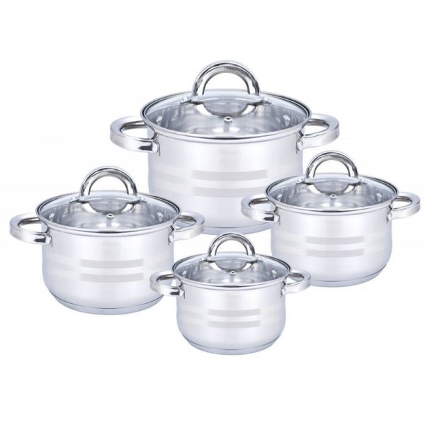Vito set lonaca od nehrđajućeg čelika kombinira funkcionalnost s dizajnom Sadržaj kompleta: 1 x lonac s poklopcem: promjer – 14 cm, visina – 8,5 cm, kapacitet 1,3 l 1 x lonac s poklopcem: promjer – 16 cm, visina – 9,5 cm, kapacitet 1,9 l 1 x lonac s poklopcem: promjer – 18 cm, visina – 10,5 cm, zapremina 2,6 l 1 x lonac s poklopcem: promjer – 22 cm, visina – 12,5 cm, kapacitet 4,7 l 1 x tava s poklopcem i neljepljivim premazom: promjer – 22 cm, visina – 6,5 cm