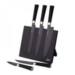 Kuhinjski noževi s magnetskom trakom – moderan dizajn i kvalitetna izrada. Set uključuje 6 elemenata:1 x kuharski nož: 33,5 cm1 x nož za kruh: 33 cm1 x kuhinjski nož: 34 cm1 x univerzalni nož: 25 cm1 x nož za piling: 20 cm1 x magnetski blok: 24 x 21 cm
