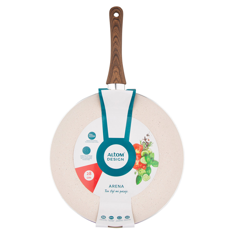 Veličina tave: promjer – 28 cm · prženje u tavi Arena jamči izvrstan okus i miris pripremljenih jela, uz zadržavanje svih nutritivnih vrijednosti · Tava je prekrivena visokokvalitetnim neprijanjajućim premazom s efektom skale koji ima svojstva koja se ne lijepe, sprječavajući lijepljenje · Tava ima debele zidove i dno koji omogućuju bolje nakupljanje i raspodjelu topline, zahvaljujući kojima Jela pripremljena u njemu brže se prže i duže održavaju temperaturu · Prikladan za sve vrste štednjaka, uključujući indukcijske štednjake · Visokokvalitetni neljepljivi premaz čini Održavanje tave čistom vrlo je jednostavno