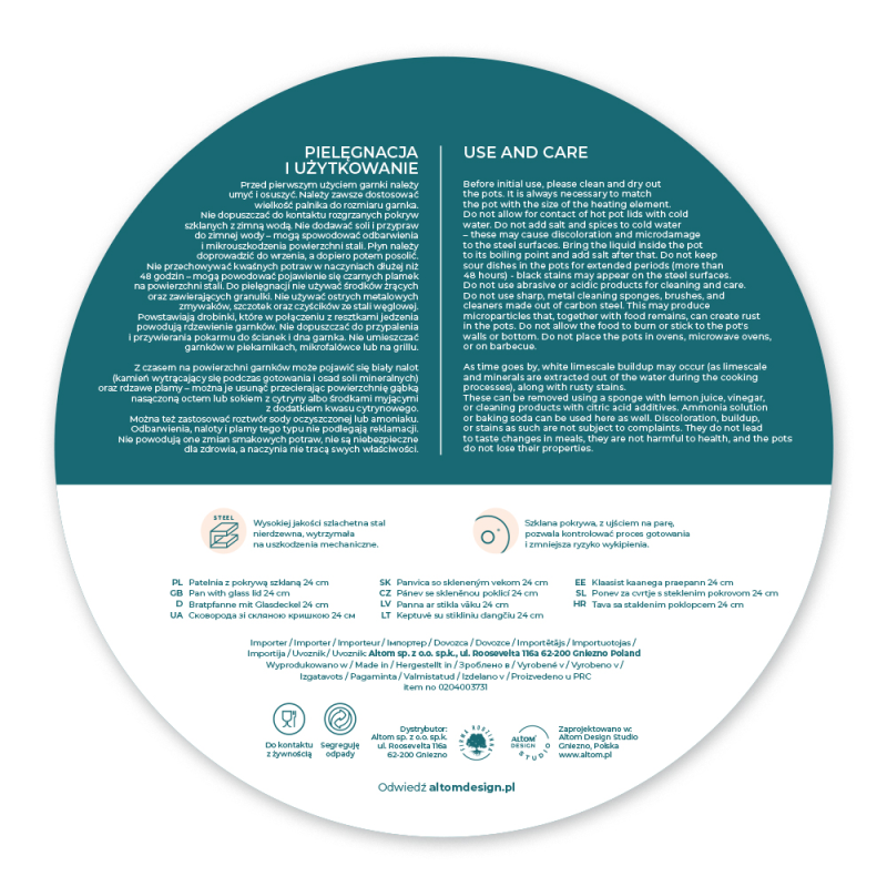 Emilio lonci od nehrđajućeg čelika – elegancija i trajnost na vašem kuhinjskom putu. Emilio lonci od nehrđajućeg čelika kombinacija su trajnosti, funkcionalnosti i elegancije u jednom. Izrađene od visokokvalitetnog nehrđajućeg čelika, izrađene su kako bi se suočile i s najzahtjevnijim kulinarskim izazovima. Bez obzira jeste li iskusni kuhar ili tek započinjete svoju avanturu kuhanjem – naši lonci bit će vaš nezamjenjiv partner u kuhinji i pomoći će vam da postignete izvrsne rezultate. · Napravljene posude izrađena od najkvalitetnijeg nehrđajućeg čelika, koji predviđa Čak i raspodjela topline za savršene kulinarske rezultate. · Nehrđajući čelik je Otporan na koroziju, mrlje i mehanička oštećenja, što znači da će lonci zadržati svoj izgled i funkcionalnost dugi niz godina. · Debljina stijenke lonca je 0,4 mm, tako da Posuđe duže čuva toplinu. · Hvala prozirni stakleni poklopci, možete slijediti svaki korak kuhanja bez potrebe za skidanjem, štedeći vam vrijeme i energiju. · Odušak za paru U poklopcu vam omogućuje kontrolu količine pare koja se oslobađa tijekom kuhanja. · Nehrđajući čelik je prehrambeno neutralan materijal, što znači da ne ispušta tvari u posuđe i ne mijenja njihov okus. · Minimalistički i moderan dizajn lonaca iz kolekcije Emilio čini uklopiti se u svaki interijer. · Bakelitne ručke otporni su na temperature do 180 °C. · Nehrđajući čelik lako se održava čistim. Emilio Lonci mMožete ga oprati u perilici posuđa. · Lonac od nehrđajućeg čelika možete koristiti na svim vrstama štednjaka, uključujući indukciju. Kapacitet proizvoda : 2,8 l Promjer: 24 cm Visina: 7 cm
