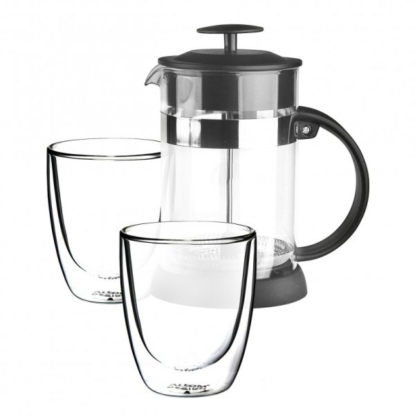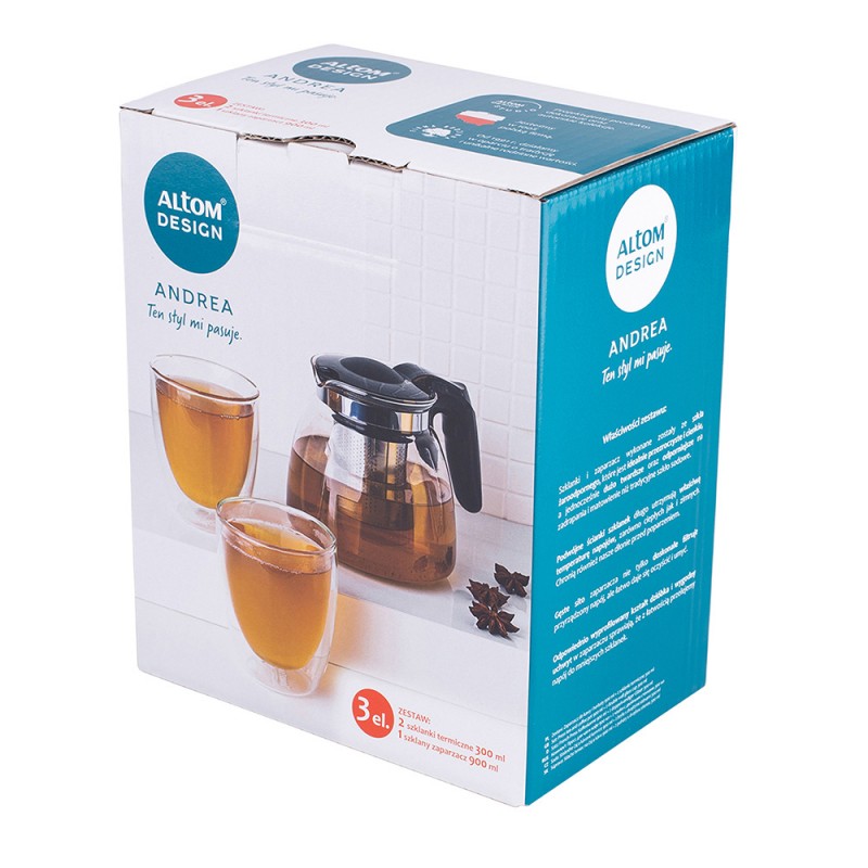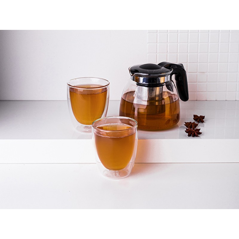 Staklene / termalne šalice za kavu i čaj s dvostrukim stjenkama i dnom Altom Design Andrea 300 ml (set od 2 čaše) + vrč s infuserom od 900 ml Termalne čaše s vrčem u kuhinji su dizajnerski hit Set uključuje: 2 x šalice: kapacitet – 300 ml 1 x vrč s infuserom: kapacitet 900 ml
