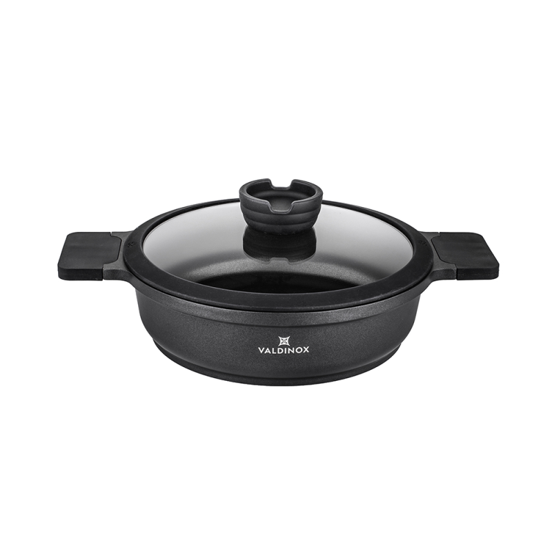 Tava je opremljena integriranom ručkom otpornom na toplinu s mat teksturom. Na taj se način ručka neće odvrnuti i slomiti, kao što se događa u tradicionalnim tavama. Tava iz kolekcije Valdinox Expert izrađena je od jednog komada lijevanog aluminija. Zatim je tretiran trostrukim slojem Illag Premium neprijanjajućeg premaza. Iz tih razloga, tava je čvrsta i zahtijeva malo masti da se prži u njoj. Tavu je vrlo lako održavati čistom. Dimenzije 24 cm Kapacitet 2,5 litara