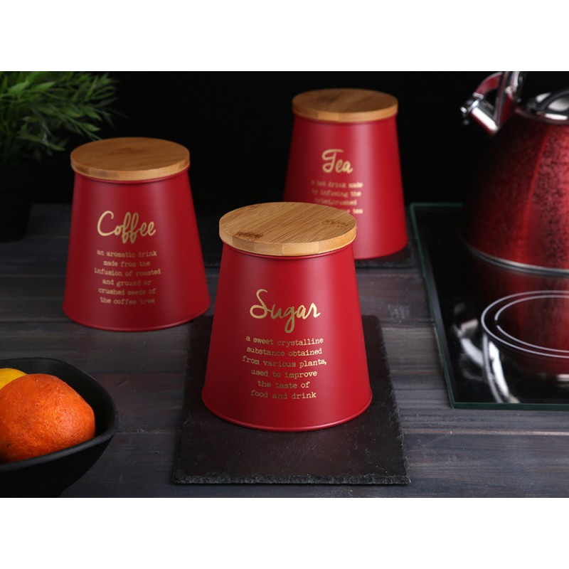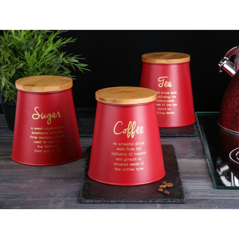 Limenka / posuda za čaj s stožastim bambusovim poklopcem Altom Design crvena, decor TEA Konusne metalne limenke s poklopcima od bambusa praktičan su i dizajnerski način za pohranu kave, čaja, šećera i ostalih sirovina. Dimenzije limenke : promjer poklopca – 10,5 cmpromjer baze – 14 cmvisina – 14,5 cm