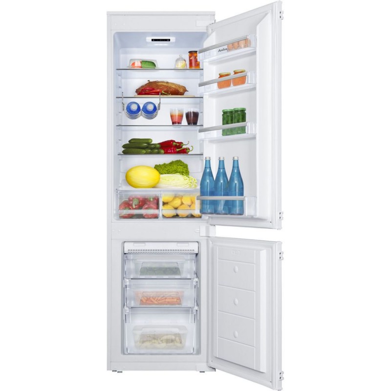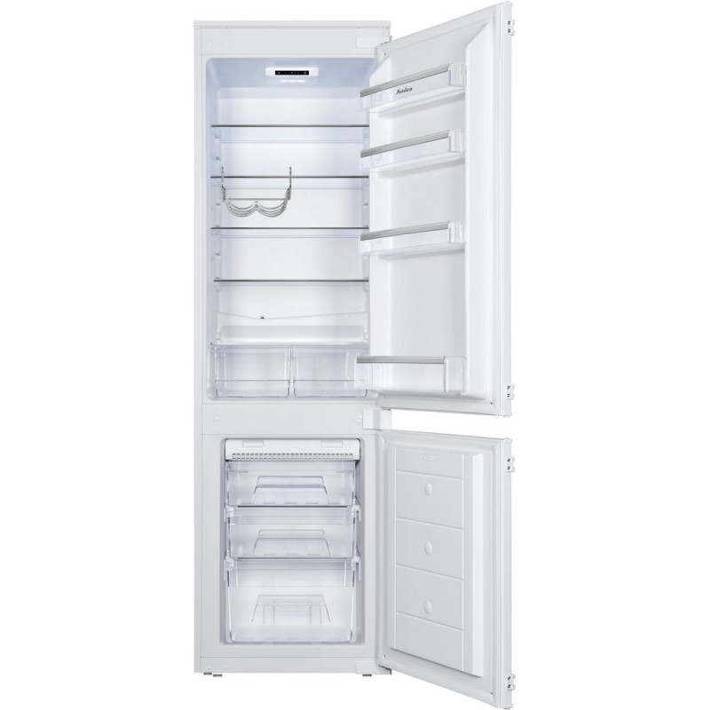 Amica ugradbeni kombinirani hladnjak – 177 cm Brutto kapacitet: 272 l; Netto kapacitet hladnjaka: 190 l; Netto kapacitet zamrzivača: 70 l; Energetski razred: A+; Kapacitet zamrzavanja: 3.5 kg/24h; Pohrana namirnica kod nestanka struje: 11 sati; Dnevna potrošnja energije: 0.75 kWh; Godišnja potrošnja: 274 kWh; Razina buke: 41 dB; Broj polica – 5 / Broj ladica u zamrzivaču – 3 Mehaničke kontrole / Univerzalna vrata / Antibakterijski sistem Automatsko odleđivanje / Slide System – lagana i brza instalacija / polica za jaja / LED svjetlo Ladice za voće i povrće Dimenzije: 177.6x54x54 cm