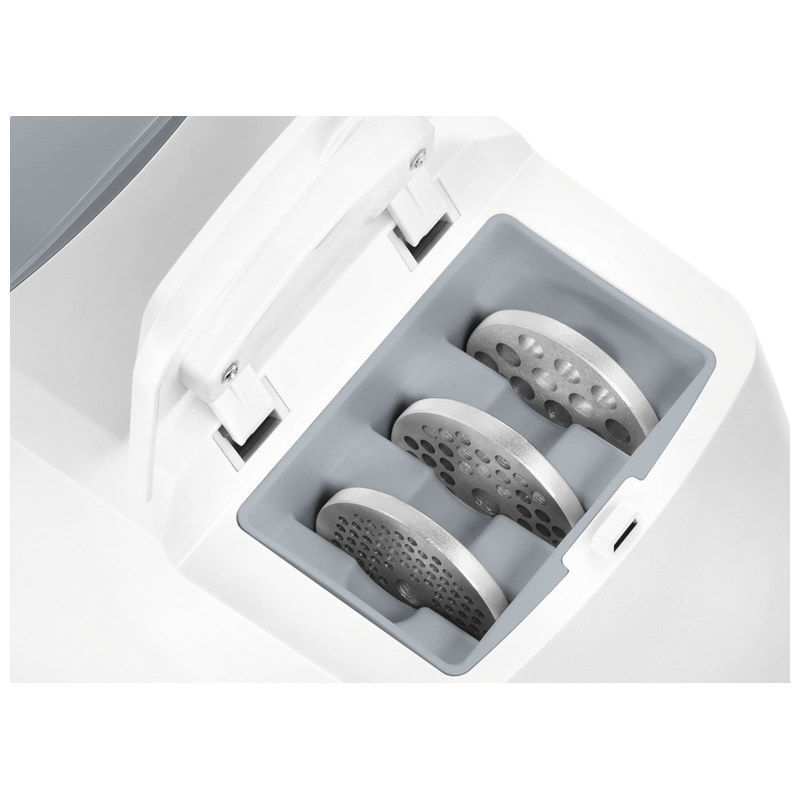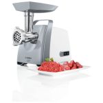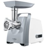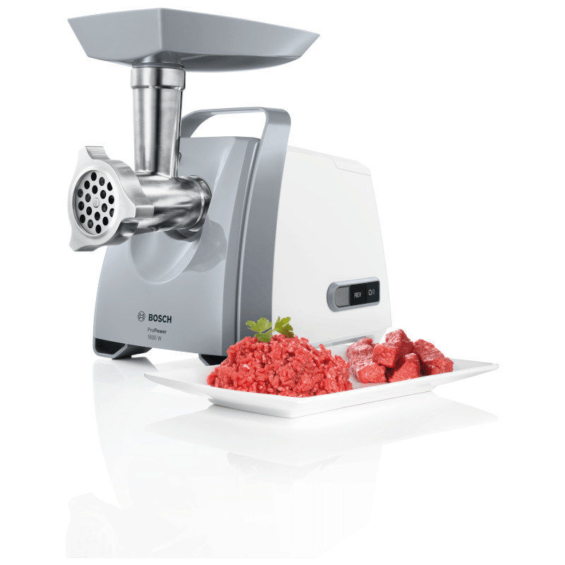 Bosch uređaj za mljevenje mesa, ProPower, 1800 W, Bijele boje. Snažan motor s visokom snagom zaustavljanja od 1800W: jednakomjerna obrada mesa u najkraćem mogućem vremenu. Funkcija okretanja u drugom smjeru: pouzdana pomoć za otpuštanje hrane koja je zapela. Nastavak za mljevenje mesa za brzu i pouzdanu svakodnevnu preradu. Nastavak za kobasice: jednostavan način za punjenje svježih, domaćih kobasica. Nastavak za mesne okruglice kebbe: za jednostavniju pripremu ukusnih tradicionalnih jela. Disk za rezanje od nehrđajućeg čelika: otporan, siguran za hranu, neutralnog okusa i jednostavno se čisti.