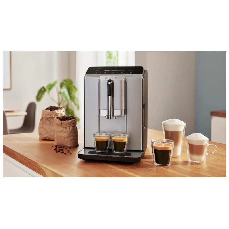 Potpuno automatski aparat za kavu. Funkcija OneTouch: svi specijaliteti od kave pripremaju se pritiskom na tipku, bilo da želite espresso, cappuccino ili bijelu kavu. MilkMagic Pro: za jednostavnu pripremu cappuccina i bijele kave. Ulijte mlijeko u šalicu, ostalo će se izvesti pritiskom na tipku. Zauzima jako malo mijesta i jednostavno se upotrebljava sa svime prikladno postavljenim na prednjoj strani.