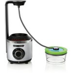 Vakuumski blender VitaMaxx, snaga: 1000 W i brzina do 37000 o/min. VitaMaxx je 2-u-1 uređaj: možete vakuumsko pakirati hranu i napitke u posebne vakuumske dodatke. Tako ostaju svježi do 2 puta dulje. Vakuumsko miješanje znači obradu s minimiziranim kisikom. Tako vitamin C i hranjive tvari osjetljive na kisik ostaju duže očuvani nego kao s običnim miješanjem. Jednostavno čišćenje: Automatski program čišćenja i dijelovi koji se mogu prati u perilici posuđa.