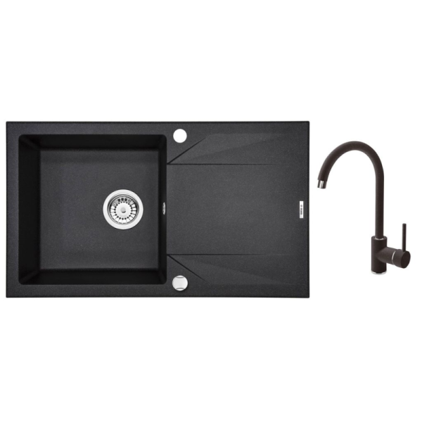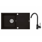 Odličan kuhinjski komplet sastavljen iz sudopera i slavine. Snažni granitni sudoper omogućuje odlaganje vrućih posuda čak do 250°C. Specijalni premaz sprječava nastajanje ogrebotina koje bi mogle nastati pomicanjem posuda po površini korita sudopera. Sudoper: boja: nero (crna) način ugradnje: klasičan dimenzije (D x Š x D): 78 x 44 x 18 cm veličina elementa: 50 cm promjer odvoda: 3,5” izvedba: reverzibilno (okretna) uključeno: sifon –  skočni ekscentar (otvor se otvara i zatvara uz pomoć gumba) i space saver (sifon dizajniran za povećanje iskoristivog prostora u donjem elementu) Slavina: oblik: s jednom ručkom boja: crna (mat) način montaže: stojeći visina: 35,5 cm duljina do odvoda: 17,3 cm klasa protoka: Z – 9 l/min razina buke (dB): I – ispod 20 Jamstvo:  10 godina