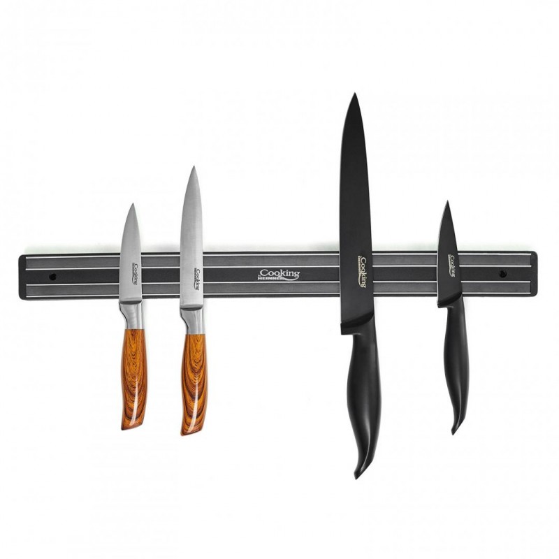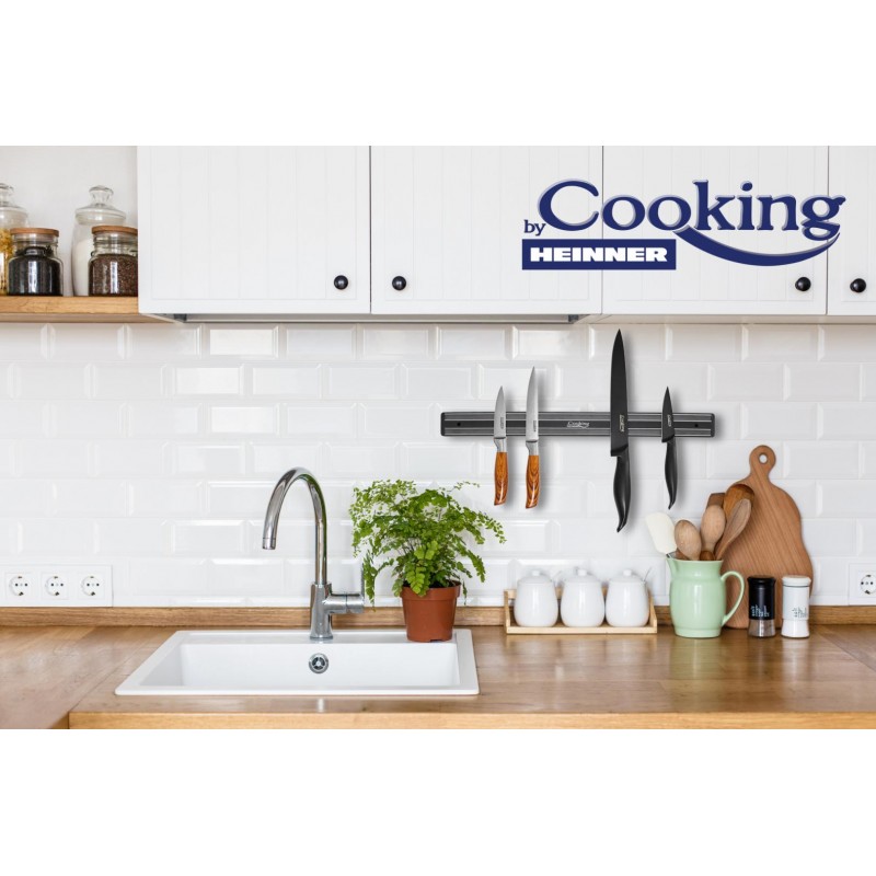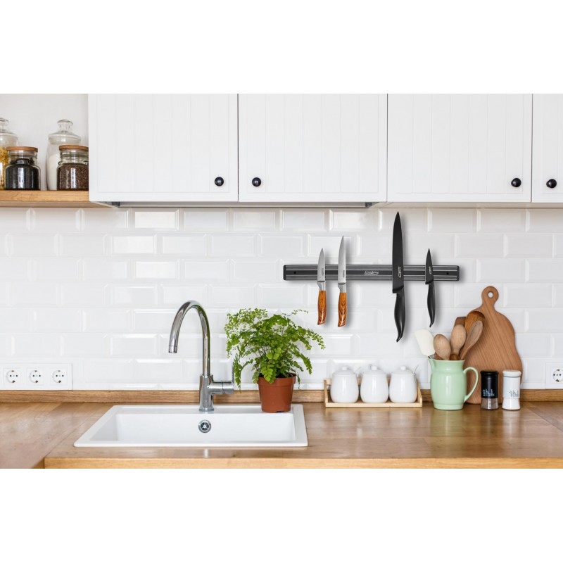 HEINNER MAGNETNI NOSAČ NOŽEVA, 47X4.3X2.4CM Magnetski držač se koristi za vertikalno skladištenje noževa. Opremljen je s dva reda ugrađenih magneta, za sigurno pričvršćivanje noževa. Noževi će uvijek biti položeni s nožem na pravoj udaljenosti za sigurnu uporabu. Maksimalan broj noževa koji se mogu pohranjena na nosaču je 4 do 6 komada, ovisi o širini lopatica ili veličini ručki. Paket sadrži potrebne tiple i vijke za montažu nosača na kuhinjski zid. Upute za montažu: Nosač držite na zidu u željenom položaju, pazeći da da su oba kraja na istoj razini. Označite položaj nosača. Podrška za povratak, mjera udaljenost između rupa i označiti njihov položaj. Provjerite je li nosač montiran ispravno i ne stavljajte ga na dohvat ruke djece.