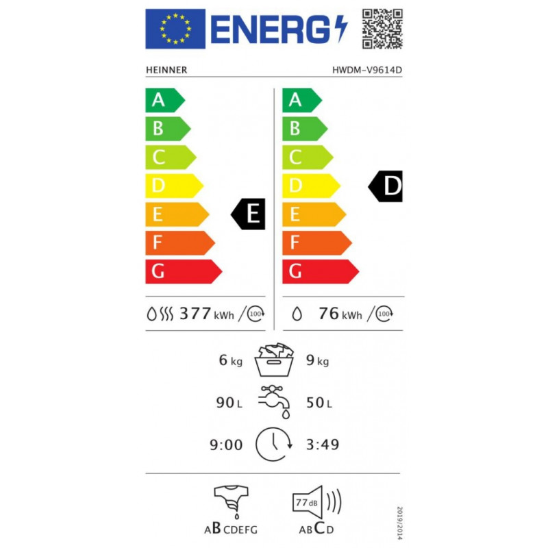 Heinner perilica rublja sa sušilicom HWDM-V9614D, kapacitetom pranja 9 kg, kapacitetom sušenja 6 kg, brzinom centrifuge 1400 o / min, energetskim razredom D, 15 programima, LED zaslonom, Brzim programom 15 min, Program pranja i brzog sušenja 1H, 3 mogućnosti sušenja, Funkcija odgođenog pokretanja, sustav za otkrivanje pola opterećenja, selektor temperature pranja, birač brzine centrifuge, Dječja pristupna brava, Dimenzije : 59,7×58,2×84,5 cm, Boja: Bijela