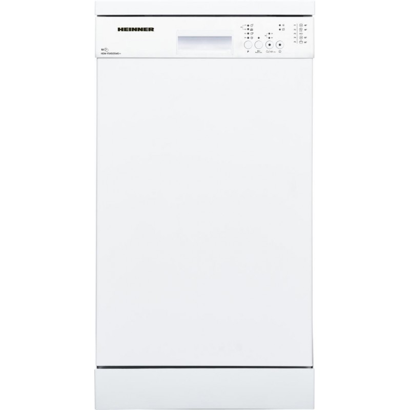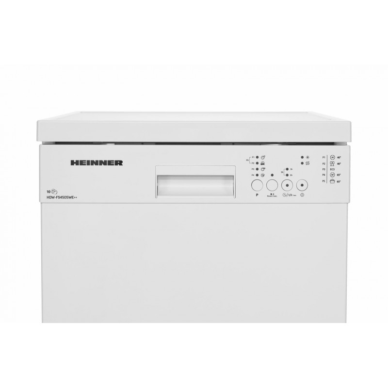 Heinner samostojeća perilica posuđa HDW-FS4505WE++, 10 setova, energetski razred E, elektroničko upravljanje, 5 programa pranja, 30′ brzi program, Kup/ Delikatni program, intenzivan program, ECO program, opcija polupunog opterećenja, programabilni start (3-6-9H), gornja košara podesiva po visini (prazna), zaštita od poplava – Aquastop, potrošnja vode: 11L / ciklus pranja, dimenzije : 85 x 44,8 x 59,8 cm Dimenzije Širina 45 cm, Neto dimenzije Visina 85,00 cm, Dubina 59,80 cm, Težina 35,80 kg, Širina 44,80 cm,   Pola opterećenja Da Broj košara 2 Kapacitet 10 setova Broj programa 5 Energetski razred E Boja Bijela Odgođeni početak Da Vrsta prikaza Ne Funkcije proizvoda Aquastop Programi Brzih 30′, nježnih 40°C, eko, super 50′, intenzivno 65°C