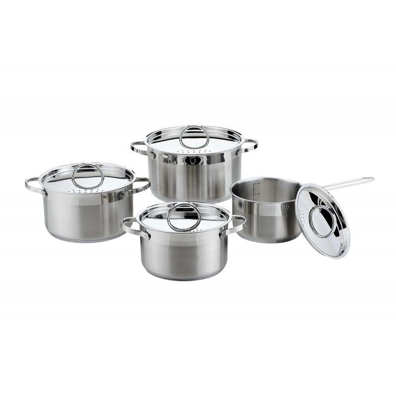 Heinner set za kuhanje Aleida 8 KOMADA SET ZA KUHANJE Materijal: nehrđajući čelik Debljina nehrđajućeg čelika 0,6 mm Kapsulirana baza: 5 slojeva (nehrđajući čelik + 1,0 mm aluminij + 1,0 mm čelik + 1,0 mm aluminij + nehrđajući čelik) set sadrži: 1 x lonac 16 x 9,5 cm , 1,8 L + poklopac 1 x lonac 18 X 10,5 cm, 2,5 L + poklopac 1 x lonac 20 X 11,5 cm, 3,5 L + poklopac 1 x lonac 24 x 13,5 cm, 6 L + poklopac može se koristiti na svim vrstama ploča za kuhanje, uključujući i indukcijske ploče