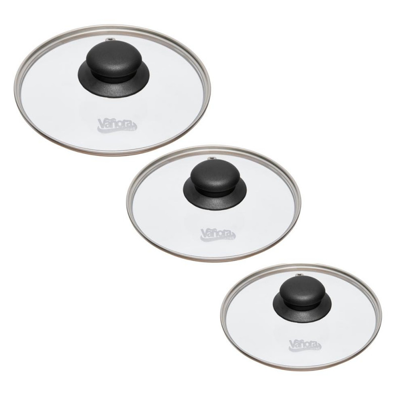 SET OD 3 STAKLENA POKLOPCA: 20 / 18 / 16 CM, VANORA HOME Materijal: staklo Bakelitna ručka Operite prije prve i nakon svake uporabe toplom vodom i tekućim deterdžentom. Također su prikladni za perilicu posuđa.