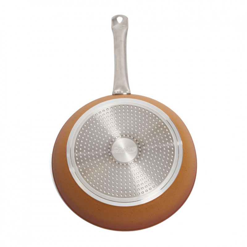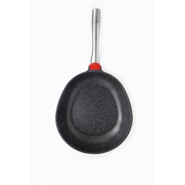 ALUMINIJSKA TAVA 28×5,5 CM Materijal: kovani aluminij + ručke od nehrđajućeg čelika Neljepljivi pjeskareni mramor Mramorna pjeskarena boja otporna na visoke temperature Indukcijska baza