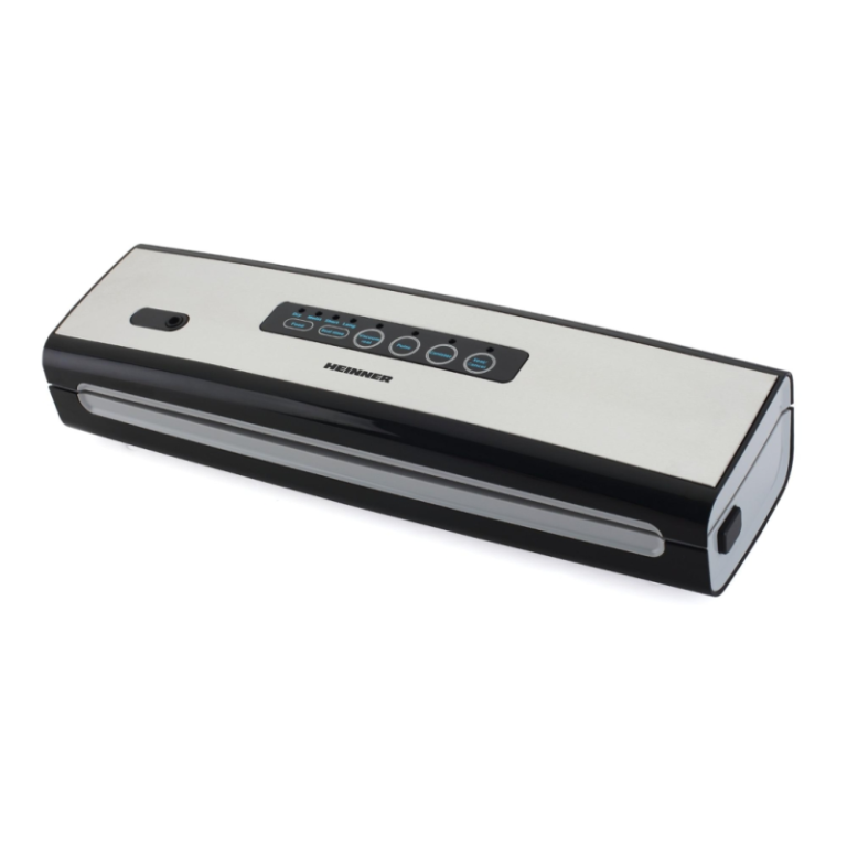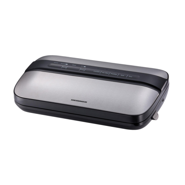 Heinner HAV-E110SS vakumirka, vakumiranje i brtva, suho i mokro vakumiranje, funkcija brtvljenja, vakuum ladice, kontrola dodira, dva načina: normalan / osjetljiv, rola vrećice 20×200 mm uključena, 5 pojedinačnih vrećica 20x30cm uključeno, crijevo spremnika, ugrađeni rezač, kompatibilan s širinom vrećica 30cm, vakuumski kapacitet: 10L / min, tlak: 80kpa, snaga: 110W, crno sa srebrnim ukrasom