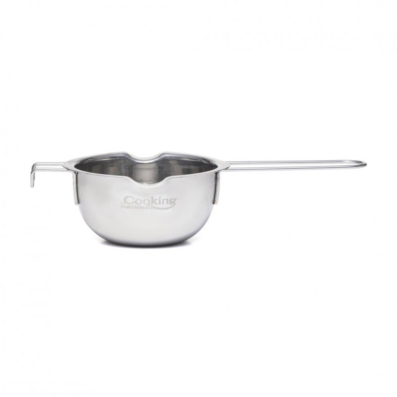 Zdjela za topljenje čokolade Dimenzije: 26x14x6 cm Vanjski promjer: 14cm,Unutarnji promjer: 11 cm Veličina ručke: 11 cm Kapacitet: 400 ml Materijal: nehrđajući čelik 18-8 težina: 170 g