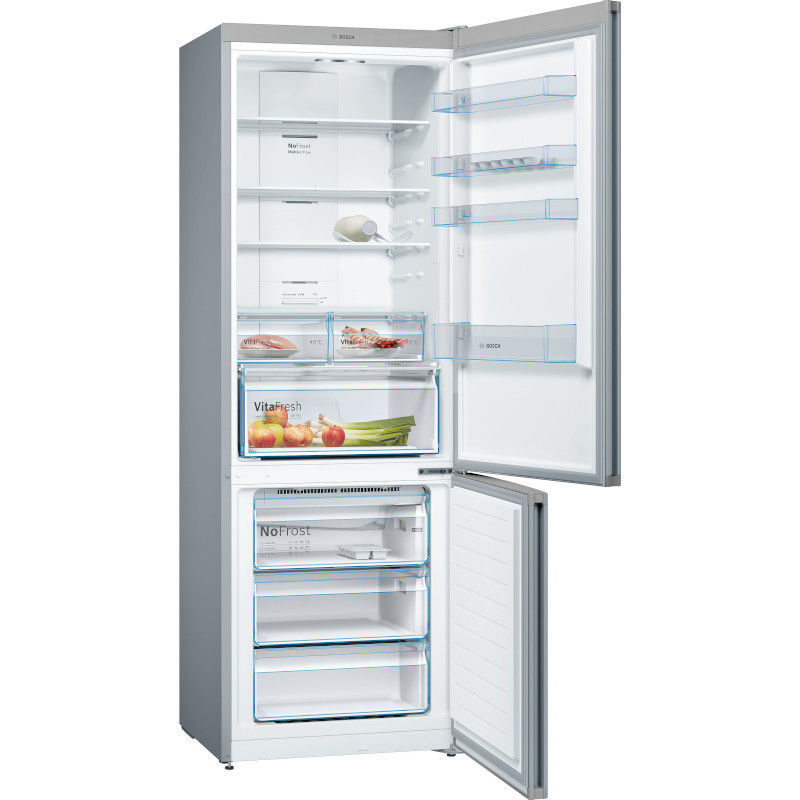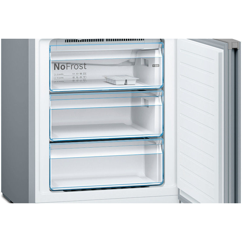 Samostojeći hladnjak sa zamrzivačem na dnu, 203 x 70 cm, nehrđajući čelik. Neto kapacitet hladnjaka: 435 l. Energetski razred: E. NoFrost hladnjak sa zamrzivačem ispod i VitaFresh plus ladicom: vaše namirnice duže čuva svježima. Perfect Fit: Uređaj se može postaviti pokraj bočnih zidova i pokućstva – moguće fleksibilno postavljanje. LED osvjetljenje: jednakomjerno osvijetli hladnjak za vrijeme cijelog životnog vijeka uređaja. VarioZone: veća fleksibilnost uz pomoć višenamjenskih staklenih polica i ladica u prostoru za zamrzavanje. Automatsko super zamrzavanje: optimalno rješenje za brže zamrzavanje manjih količina hrane uz istovremenu zaštitu zamrznutih namirnica od odmrzavanja zahvaljujući detekciji povišenja temperature i automatskom snižavanju temperature. Polica EasyAccess: izvlačiva staklena polica omogućuje bolji pristup sadržaju vašeg hladnjaka.