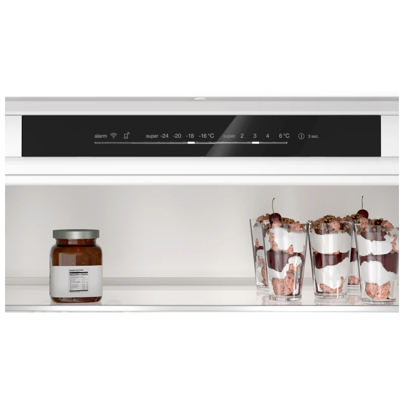 Ugradbeni hladnjak sa zamrzivačem na dnu, neto kapacitet hladnjaka (l): 285 l, neto kapacitet zamrzivača (l): 98. Dimenzije (VxŠxD): 1935 x 708 x 548 mm. SuperCooling funkcija: namirnice koje ste tek stavili u hladnjak hladi brže i tako čuva već ohlađene namirnice. 2 područja cirkulacije: odvojena regulacija hladnjaka i zamrzivača – spriječava prijenos mirisa. Energetska naljepnica: E.
