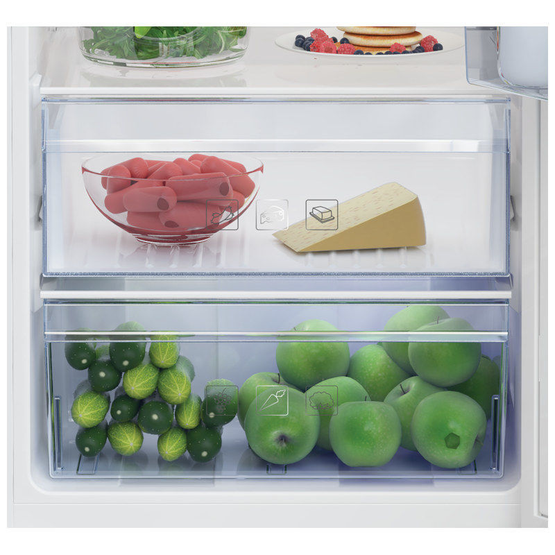 Beko hladnjak ugradbeni zapremine: 309 l, dimenzije(VxŠxD): 177,5x54x54,5 cm, mase: 55 kg. Led Illumination® ima trake s LED diodama na vrhu hladnjaka i za svaku policu na bočnom zidu, tako da možete jasno vidjeti cijeli hladnjak. Police sa sigurnosnim staklom izrađene su od kaljenog stakla i mogu nositi teret do 25 kg.