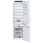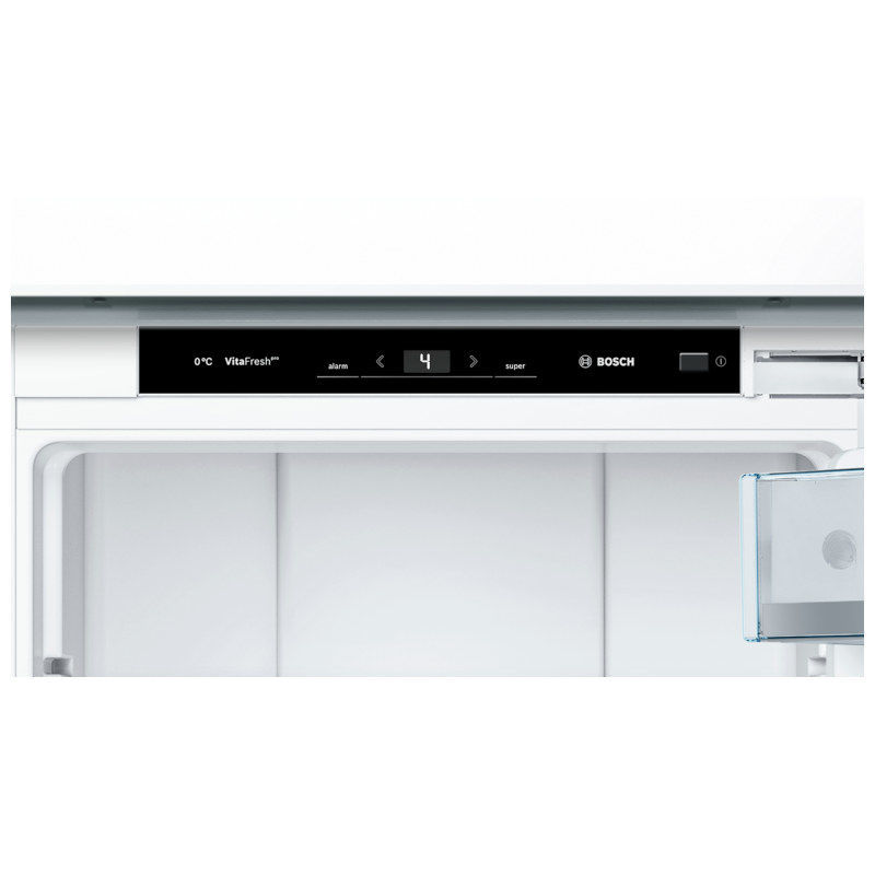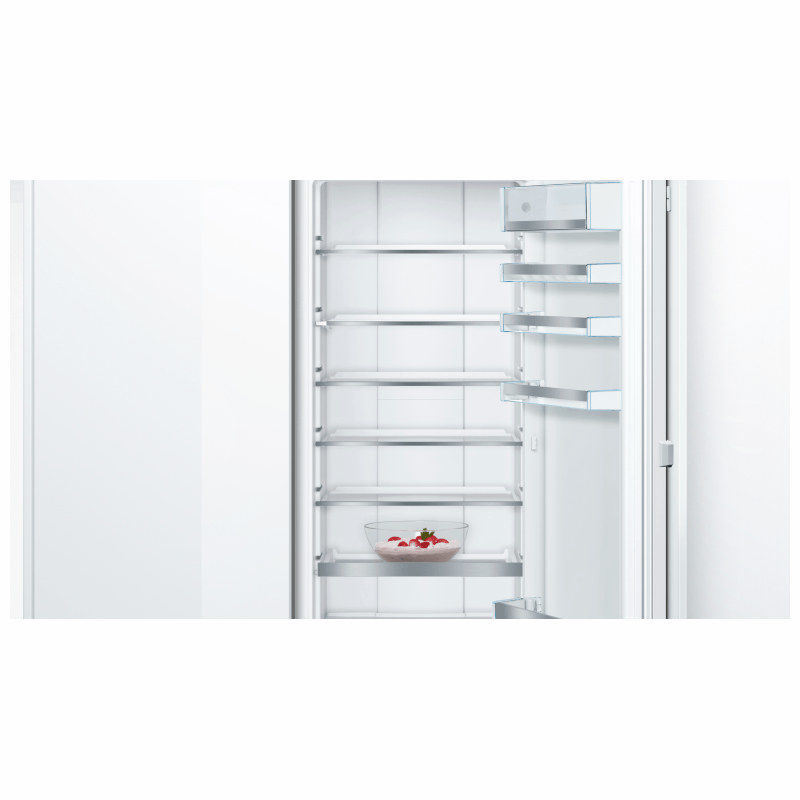 Bosch serie | 8, Ugradbeni hladnjak, 177.5 x 56 cm, fiksna šarka. VitaFresh pro: uz pomoć tehnologije 0 °C i optimalne vlažnosti zraka namirnice čuva svježima do tri puta duže. LED osvjetljenje: jednakomjerno osvijetli hladnjak za vrijeme cijelog životnog vijeka uređaja. Polica EasyAccess: izvlačiva staklena polica omogućuje bolji pristup sadržaju vašeg hladnjaka. VarioShelf: prostor za boce i posude s djeljivim staklenim policama koje se mogu razdvajati i gurnuti jedna pod drugu. SuperCooling funkcija: namirnice koje ste tek stavili u hladnjak hladi brže i tako čuva već ohlađene namirnice. Energetski razred E.