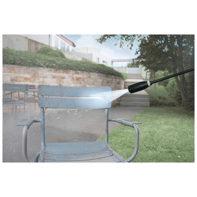Vario Power mlazna cijev: od niskotlačnog mlaza sredstva za čišćenje do visokotlačnog mlaza uz kontinuiranu regulaciju tlaka jednostavnim okretanjem na mlaznoj cijevi. Idealna za čišćenje manjih površina oko kuće i u vrtu. Na primjer za uporabu na zidovima, stazama, ogradama ili vozilima. Prikladna za sve Kärcher visokotlačne čistače klase K 2 do K 3.