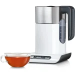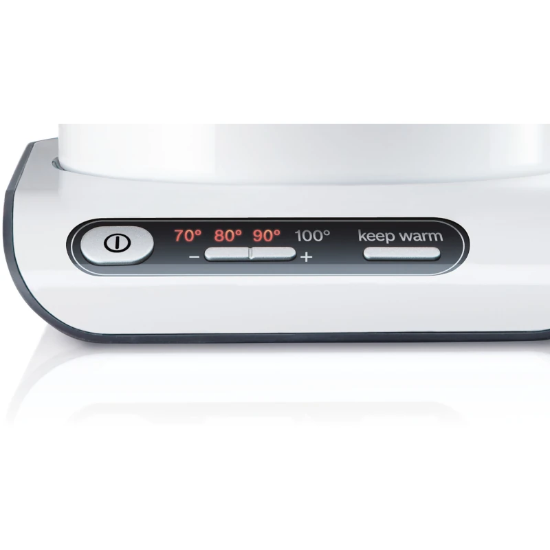 Za ljubitelje dizajna i obožavatelje čaja. Funkcija KeepWarm: voda ostaje vruća do 30 minuta. Kućište s dvostrukom stijenkom: održava vodu vrućom i jamči smanjenu temperaturu površine. Posebice veliko mjerilo vode: jednostavno očitavanje i savršena vidljivost potrebne količine vode. TemperatureControl: savršena aroma čaja zahvaljujući odabiru temperature 70°C, 80°C, 90°C te ključanju. Ergonomski rad: jednostavno otvaranje poklopca samo dodirom gumba.
