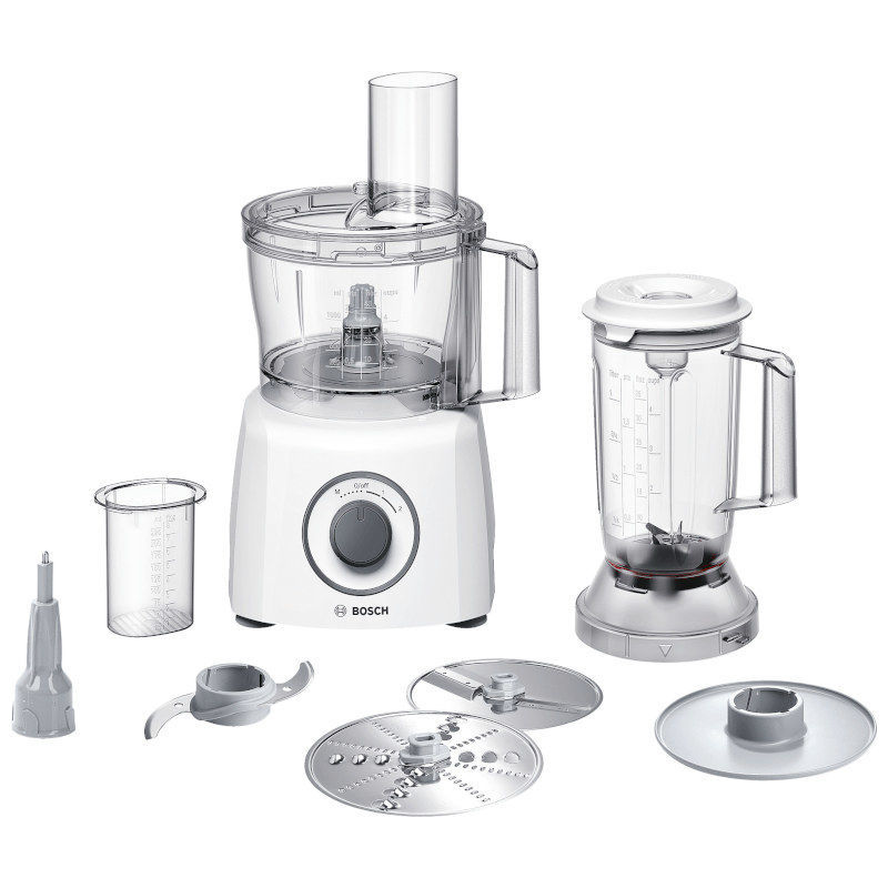 Bosch kuhinjski aparat MultiTalent 3, kompaktan i svestran kuhinjski uređaj s više od 20 funkcija. Olakšava kuhanje i pečenje, koje postaje čak i zabavno! Prednost uređaja su snažan motor: brza i jednostavna priprema jela zahvaljujući motoru s dvije razine brzine i funkcijom pulsiranja. Više od 30 funkcija: sjeckanje, rezanje, ribanje, i puno više – zahvaljujući svestranim nastavcima kao što je multi-funkcionalan nož od nehrđajućeg čelika i nož MultiLevel6. Prozirna plastična zdjela kapacitete od 2,3 l s prozirnim poklopcem i punjačem. Dodatno: nastavci se mogu pohraniti u zdjeli i tako su brzo pri ruci. Zahvaljujući pametnim oznakama, nastavci se lako namještaju. Nastavci se mogu prati u perilici za posuđe: jednostavno i pogodno čišćenje nastavaka u perilici za posuđe.