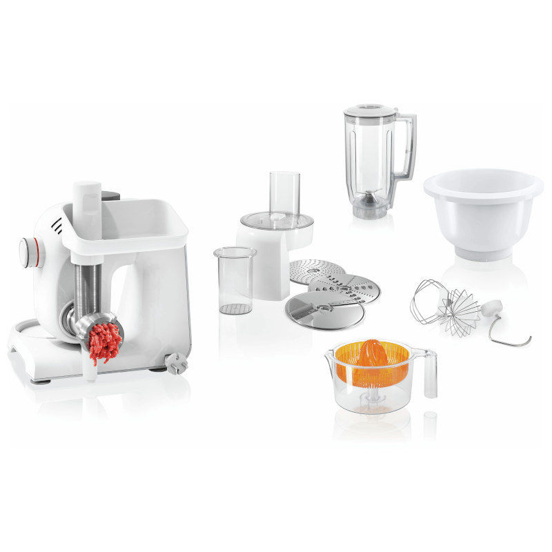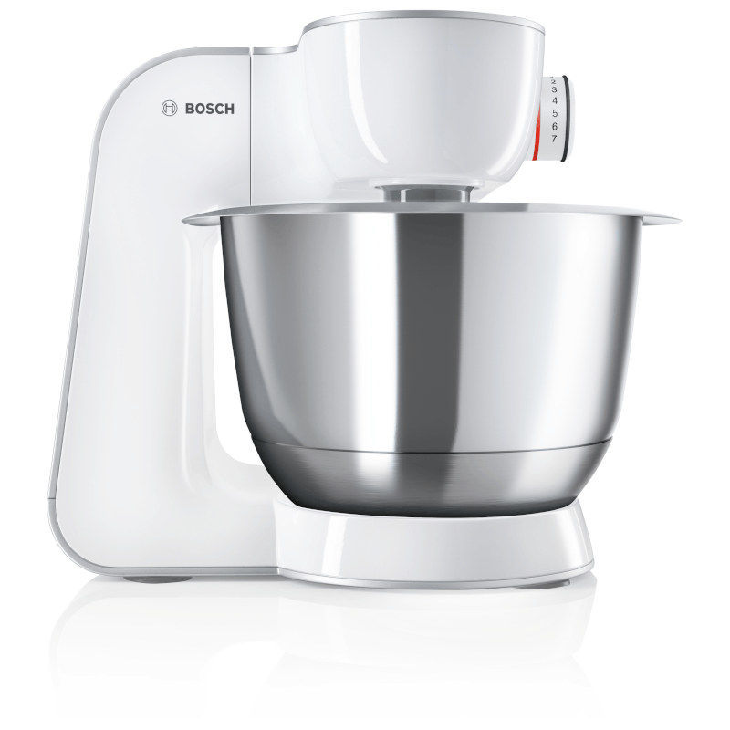 Bosch kuhinjski aparat MUM5, snaga: 1000 W, bijelo – srebrne kombinacije boja. 3D Planetary Mixing, 7 postavki brzina. Visokokvalitetna zdjela od nehrđajućeg čelika od 3,9 l prikladna je za male količina kao i za jednostavnu obradu do 2,7 kg mješavine za kolače i 1,9 kg dizanog tijesta. Velika svestranost: široka paleta pribora, visokokvalitetni i individualni dodaci.