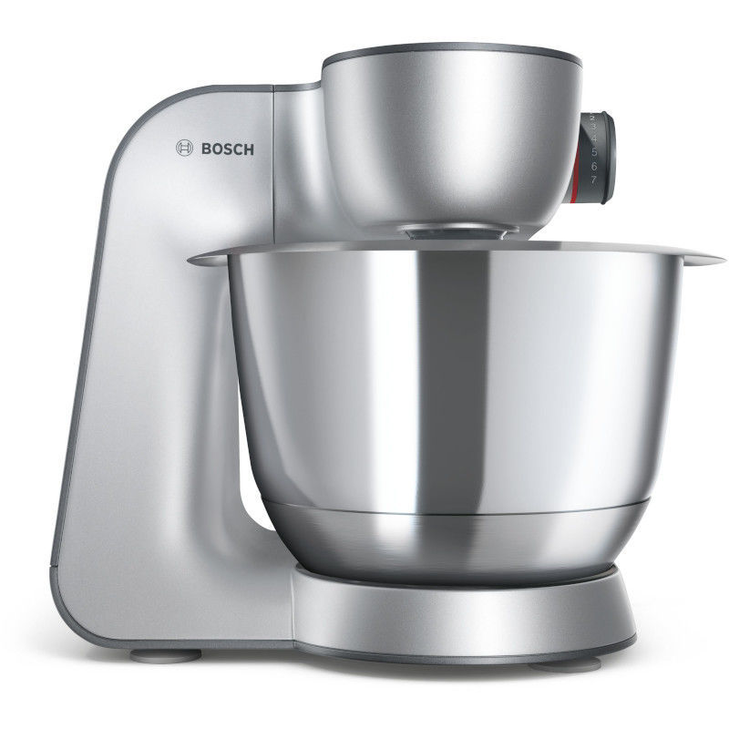 Kuhinjski robot, MUM5, snaga: 1000 W. Snažan kuhinjski robot (srebrna / antracit boja) za svestrano kuhanje i pečenje. Posebice snažan Bosch motor od 1000 vati: ispunjava visoke zahtjeve kod pečenja, kuhanja i miješanja. Za teška tijesta. Velika zdjela od nehrđajućeg čelika kapaciteta od 3,9 l: poseban oblik unutrašnjosti za optimalnu pripremu tijesta. (do 2,7 kg mješavine za torte ili 1.9 kg dizanog tijesta). Savršeni rezultati zahvaljujući sustavu 3D PlanetaryMixing koji osigurava optimalno miješanje svih sastojaka. Postavka automatskog stanja pripravnosti nastavaka za jednostavno punjenje zdjele. Velika svestranost: široka paleta pribora, visokokvalitetni i individualni dodaci.
