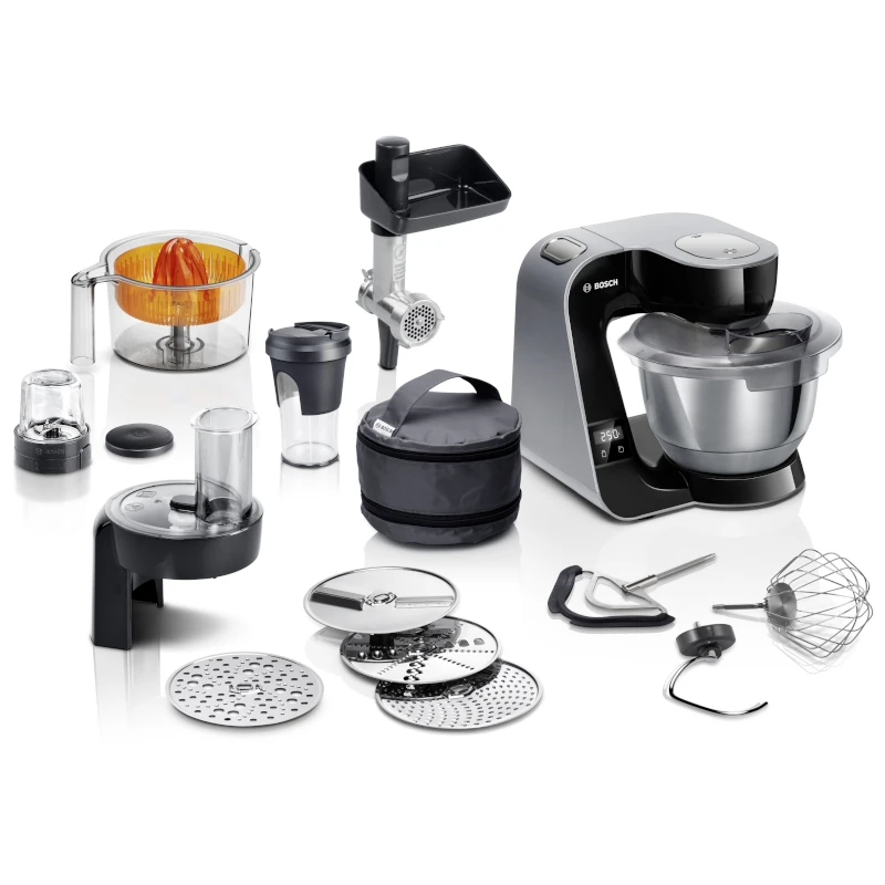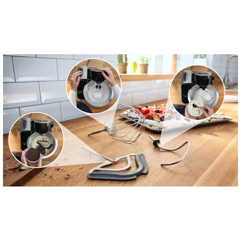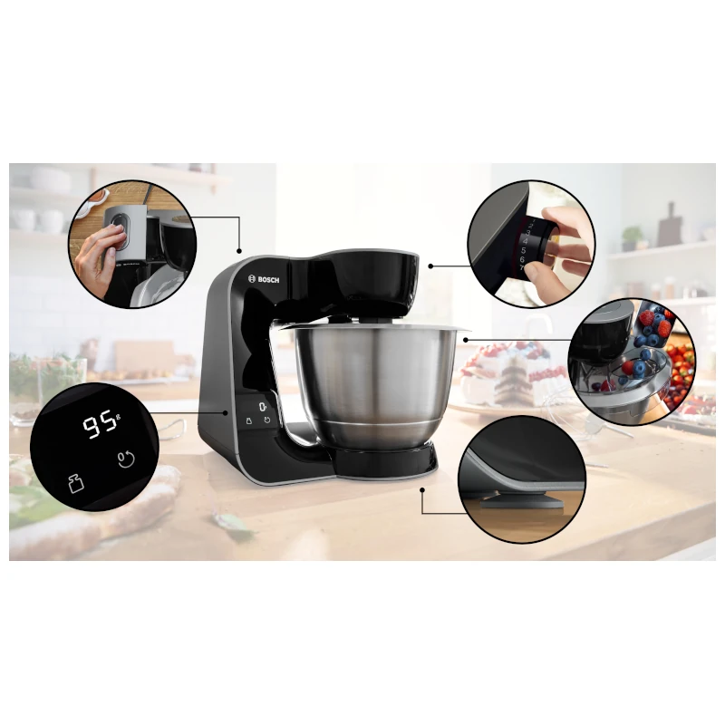 BOSCH kuhinjski aparat Serie 4, Kuhinjski robot s vagom, MUM 5, Snage 1000 W, Boja crna / tamno srebrna. Fleksibilan uređaj za pripremu širokog raspona raznolikih jela. S integriranom vagom, sada još jednostavnije. Posebice snažan Bosch motor od 1000 vati: ispunjava visoke zahtjeve kod pečenja, kuhanja i miješanja. Za teška tijesta. Elegantna crna zdjela od nehrđajućeg čelika, 3,9l: s posebnim oblikom unutrašnjosti za opimalnu pripremu tijesta. (Do 2,7 kg mješavine za kolače ili 1,9 kg dizanog tijesta). Integrirana vaga: svi sastojci mogu se vagati izravno u zdjeli ili dodatnoj opremi. Savršeni rezultati zahvaljujući sustavu 3D PlanetaryMixing koji osigurava optimalno miješanje svih sastojaka. Velika svestranost: široka paleta pribora, visokokvalitetni i individualni dodaci.