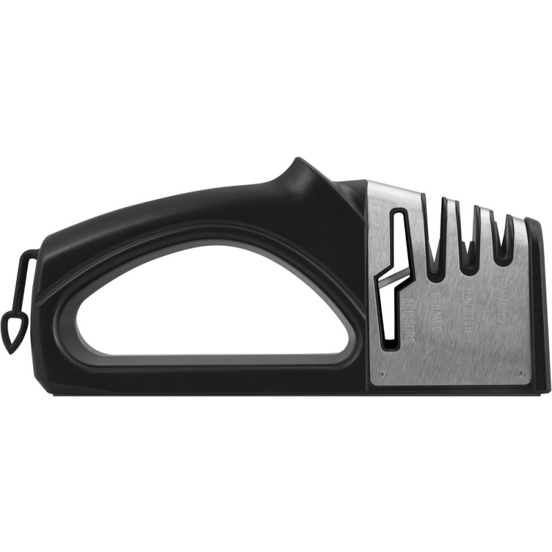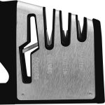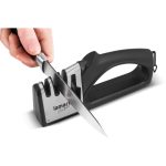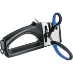 Brusač noževa i škara u 3 faze izrađen od omekšane ABS plastike s bazom protiv proklizavanja. Brusni diskovi: dijamantni kamen za popravke oštrice i ravnanje prije brušenja. Disk od nehrđajućeg volframa oštri rub i vraća “V oblik” oštrici, keramički kamen brusi oštricu i izglađuje površinske nepravilnosti, a keramički kamen oštri škare. Čistite vlažnom krpom. Brusni diskovi ne mogu se zamjenjivati. Mjere 21 x 9 x 3,5 cm Materijal plastika / čelik