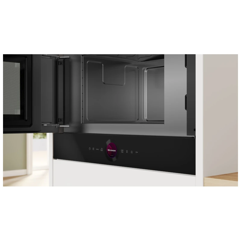 Ugradbena mikrovalna pećnica, Serie 8, crna boja. Zapremina: 21 l. Kompaktna mikrovalna pećnica od 38 cm. Tehnologija invertera: neprestana snaga mikrovalova za postupno zagrijavanje hrane. Funkcija pojačanja mikrovalova Microwave Boost: brzo i jednostavno zagrijavanje. Digitalni upravljački prsten: jednostavan i inovativan način odabira postavki. AutoPilot 7: zahvaljujući 7 prethodno postavljenih automatskih programa, svako je jelo savršen uspjeh. Unutrašnjost od nehrđajućeg čelika koja se jednostavno čisti zahvaljujući glatkim površinama bez oštrih rubova.