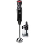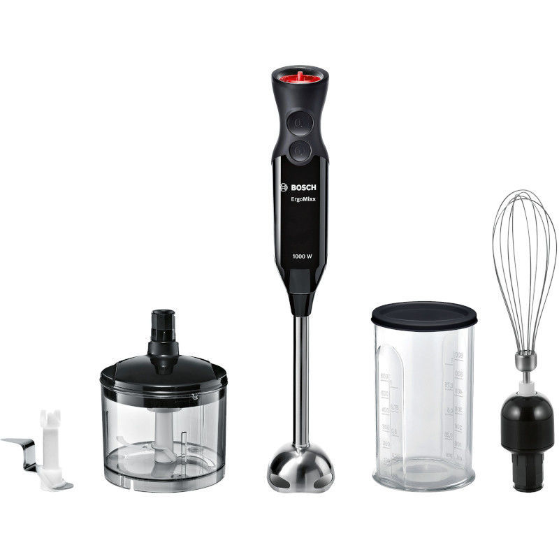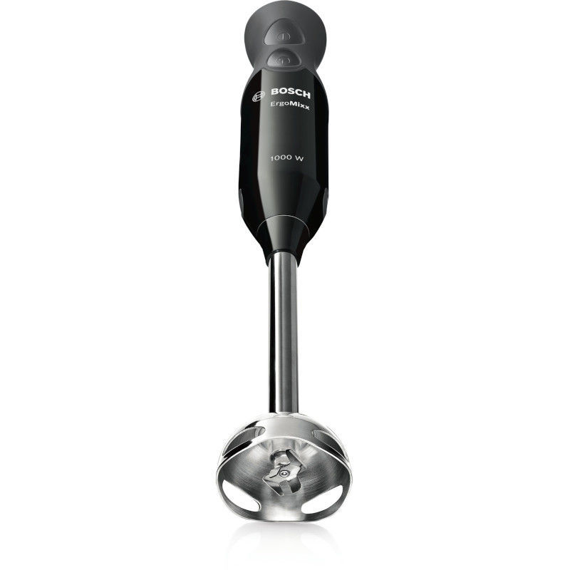 Štapni mikser ErgoMixx crne boje. Maksimalna Bosch snaga s motorom snage 1000 W za obradu najtvrđih sastojaka i upotrebu mnogih dodataka. Ergonomsko i jednostavno rukovanje: lagano kućište s drškom mekanom na dodir za udobno i sigurno držanje. QuattroBlade: jamči optimalno rezanje i fine rezultate miješanja – s funkcijom AntiSplash. Promjenjiva brzina: 12 brzina, plus funkcija turbo za savršenu gustoću svakog recepta. Sjeckalica s funkcijom drobljenja leda i uključenom metlicom: više raznolikosti s ukusnom, domaćom hranom.