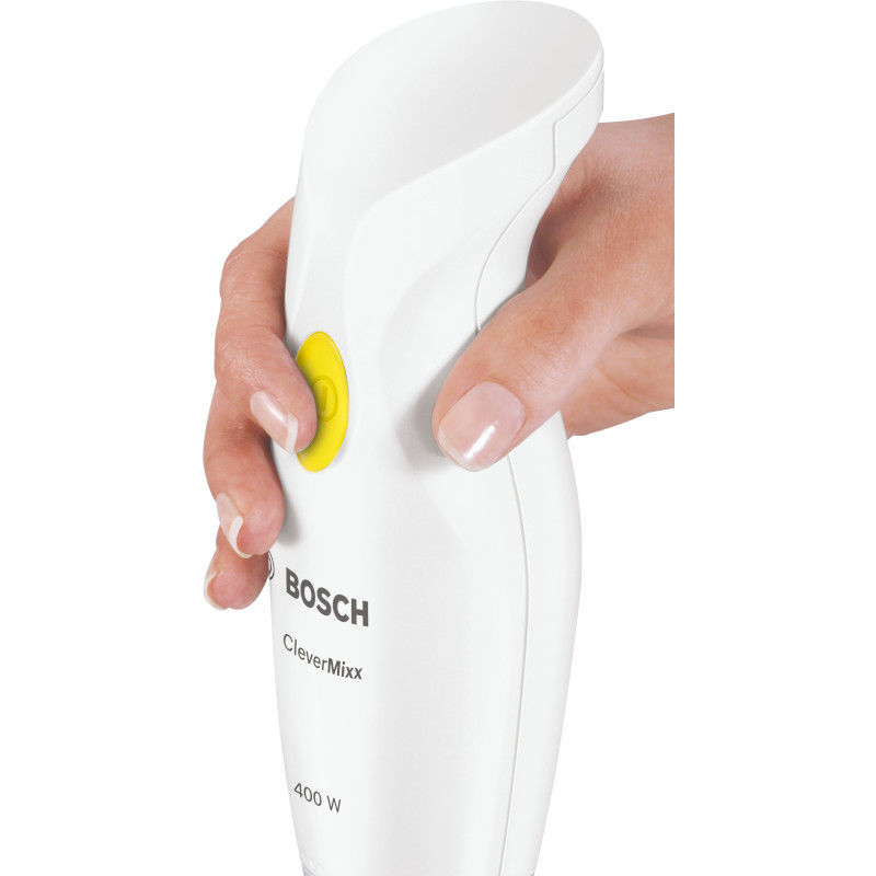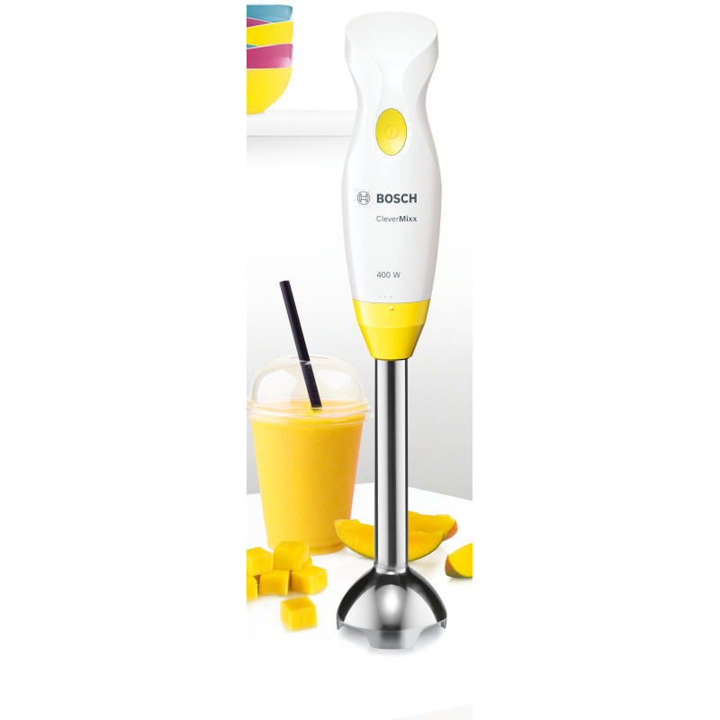 Štapni mikser, CleverMixx Fun bijela, intensive yellow. Posebice snažan motor snage 400 W za obradu zahtjevnih sastojaka te pogon raznolike dodatne opreme. QuattroBlade: jamči optimalno rezanje i fine rezultate miješanja – s funkcijom AntiSplash. Ergonomska ručka: udobno držanje prilikom miješanja. Jednostavna upotreba: započnite s miješanjem jednim pritiskom gumba. Praktična posuda za miješanje/mjerenje za jednostavno mjerenje i miješanje malih količina.