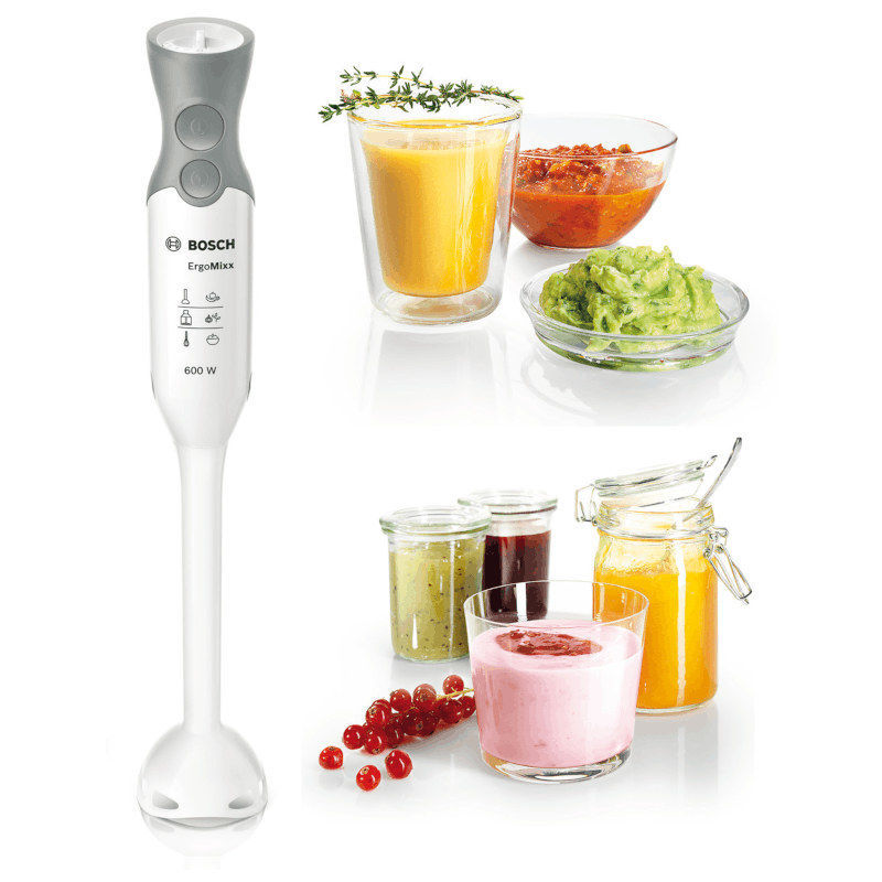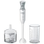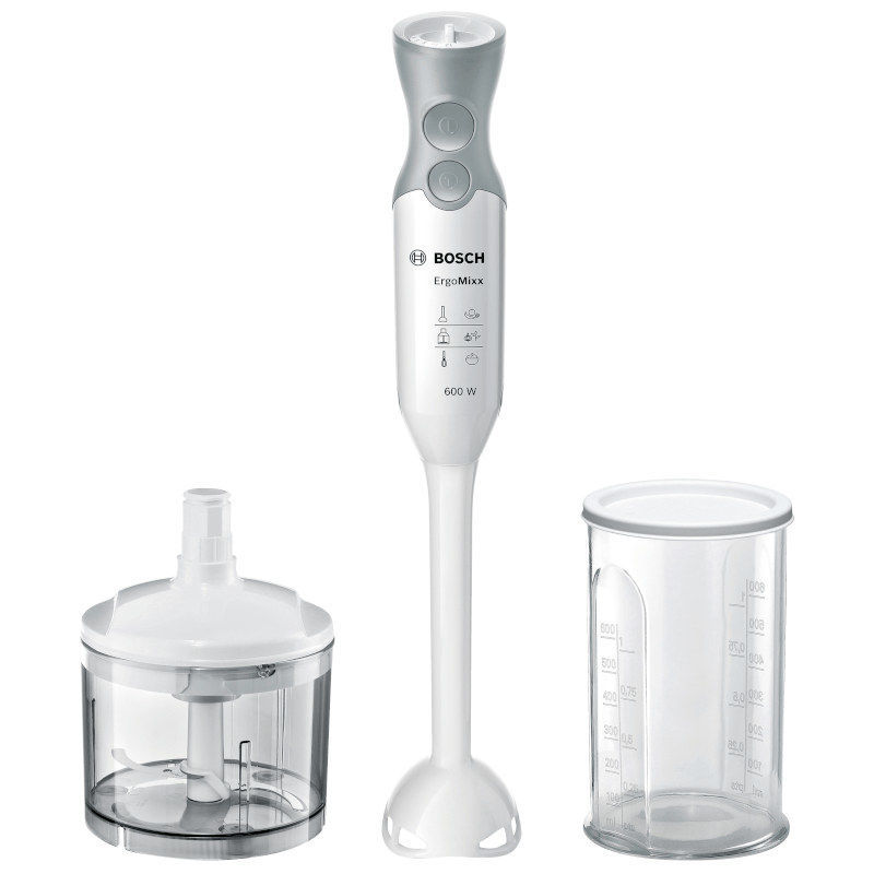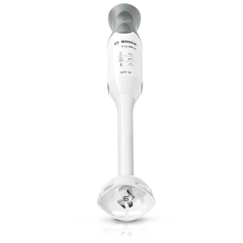Štapni mikser, ErgoMixx, 600 W, Bijeli. Posebice snažan motor snage 600 W za obradu zahtjevnih sastojaka te pogon raznolike dodatne opreme. Ergonomsko i jednostavno rukovanje: lagano kućište s drškom mekanom na dodir za udobno i sigurno držanje. QuattroBlade: jamči optimalno rezanje i fine rezultate miješanja – s funkcijom AntiSplash. Promjenjiva brzina: 12 brzina, plus funkcija turbo za savršenu gustoću svakog recepta. Uključena sjeckalica: možete sjeckati začinsko bilje, oraščiće, sir i to sve brže i jednostavnije.
