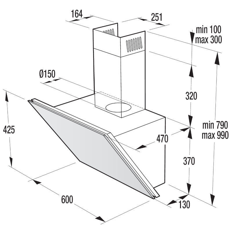 Kuhinjska zidna napa, razina buke (max.): 54 dB(A), maksimalni protok zraka kod odvodnje zraka: 570 m³/h. Širina proizvoda: 600 mm, visina proizvoda: 425mm. Energetski razred: B. Odvodnja ili recirkulacija zraka.