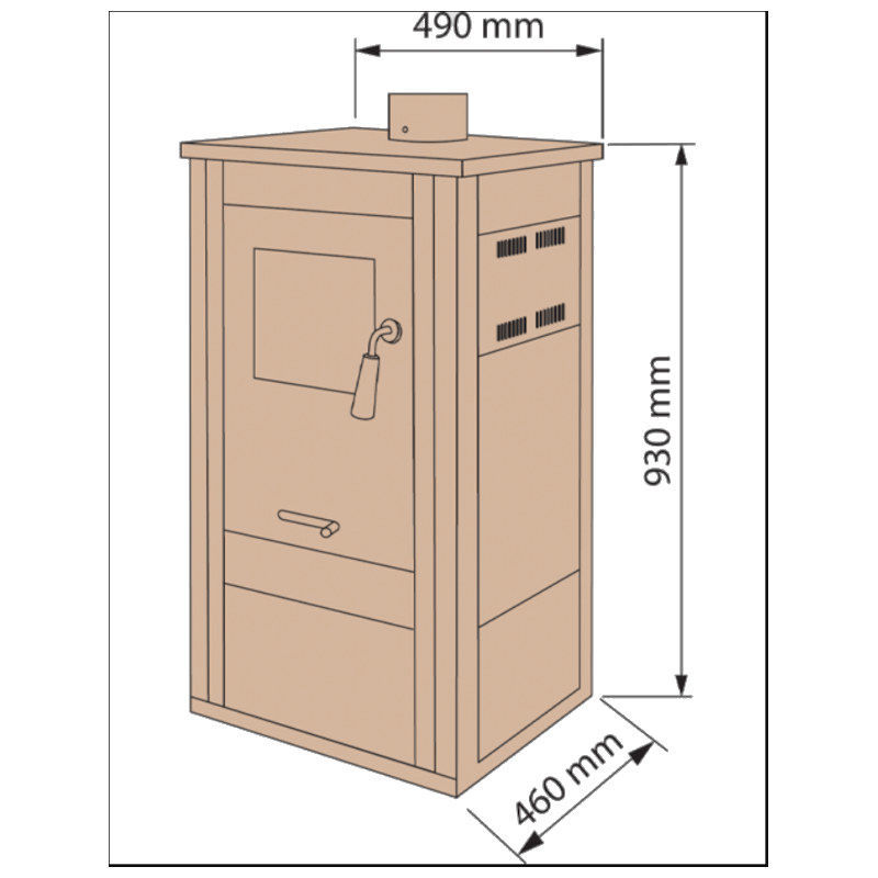 TERMOELEGANT A peć na kruta goriva, maksimalna snaga: 10,5 kW, nazivna snaga: 7 kW 8 kW. Dimenzije (ŠxVxD): 430 x 930 x 460 mm, masa: 74 kg.
