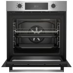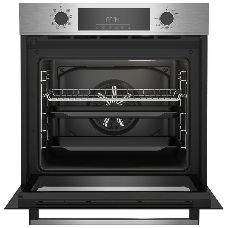Beko pećnica ugradbena zapremine: 72 l, dimezija (VxŠxD): 59,5×59,4×56,7 cm, mase: 28,7 kg. Halogena rasvjeta pomaže vam da vidite cijelu pećnicu, pa kulinarske kreacije možete pratiti sa zatvorenim vratima. Izdržljiva vrata podržavaju opterećenja teška čak 22,5 kg. Čišćenje parom: SteamShine.