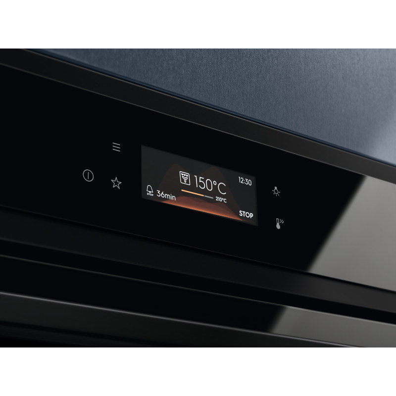 Elektronske funkcije pećnice: 154 variety of pre-set cooking programmes “Assisted Cooking” (weight/food sensor/Steam), 3 Favorites, 3 pirolitička ciklusa, 31 Languages, zvučni signal, Automatic safety switch off only oven, podesiva razine zvuka , Check Result (Finish Assist by remaining 10% duration), Child lock (in off mode), podsjetnik za čišćenje, Clock style in standby (2 versions), Cooking with Duration, Cooking with End Time and Duration, Demo mode with code, Display Brightness adjustable (ON status), Display Full colour TFT touch 95x35mm, svjetlosni prekidač za vrata, elektronska regulacije temperature, elektronsko zaključavanje, odabir brzog zagrijavanja, sonda za meso, automatsko isključivanje sonde za meso, indikator toplne jezgre pomoću sonde, Food sensor time estimation, Key tones & alarm/error tones activation/deactivation (except On/Off), jezici/tekst zaslona, glavni prekidač, prijedlog temperature, vrijeme u danu, Memory day time 3 days, minutni podsjetnik, Oven light on/off selectable (menu + direct access button), Pyrolytic cleaning (3 cycles: quick. normal. intense), Real temperature indication (°C), indikator rezidualne topline (C stupnjevi), korištenje rezidualne topline, Service info, isključivanje u određeno vrijeme u off statusu